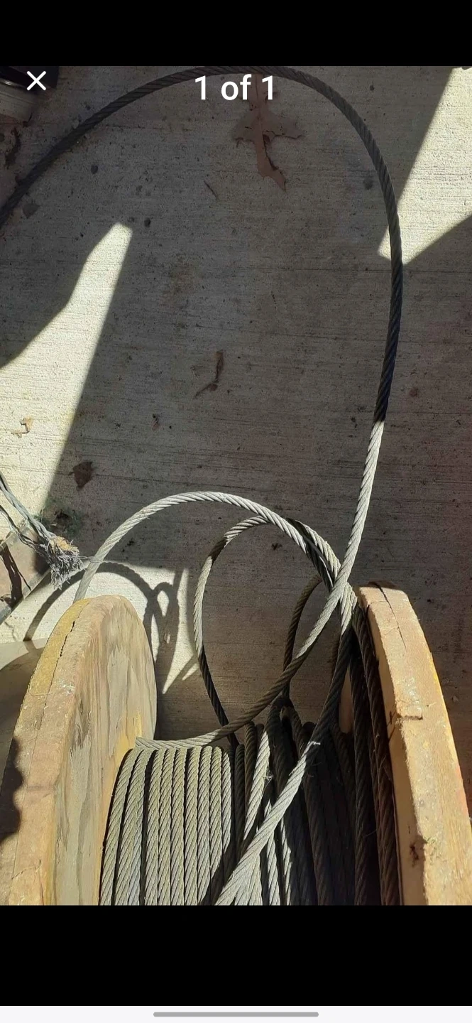 Heavy duty steel cable wound on a large wooden spool. Material is steel. Spool is made of wood. Great for construction or industrial use!