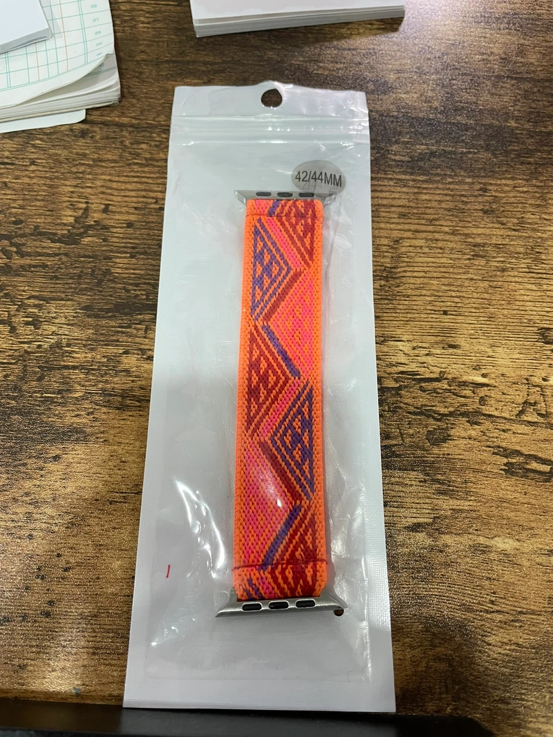 Stretchy woven nylon watch band in orange with a geometric pattern. It's designed for 42/44mm Apple Watch models. This band offers a comfortable and secure fit.