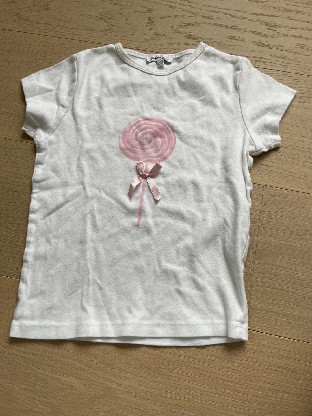 White Short Sleeve T-Shirt with Pink Lollipop Graphic - Size 6