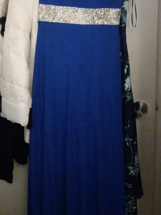 This royal blue maxi dress features a sparkling silver embellishment across the chest. It's a lovely option for a special occasion or an evening out. The fabric appears to be a comfortable jersey material.