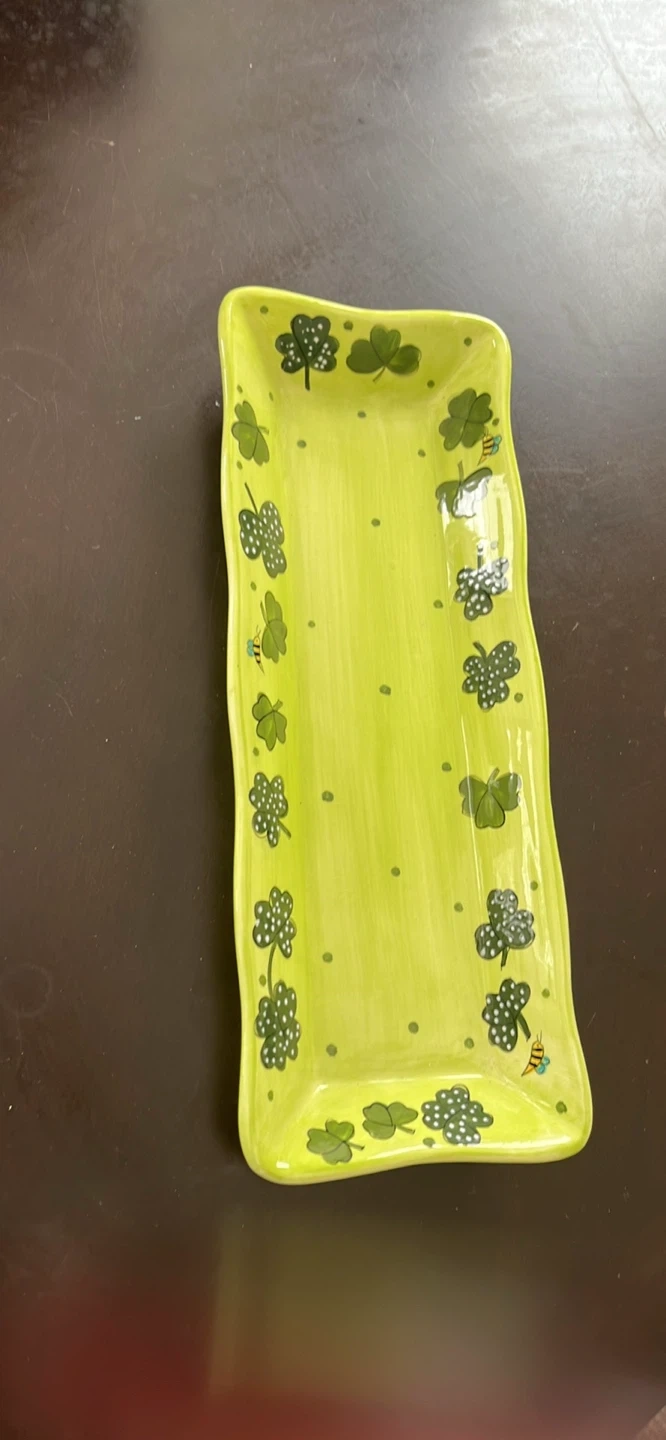 This Gates Ware ceramic tray features a St. Patrick's Day design with shamrocks and bees. It's dishwasher and microwave safe.