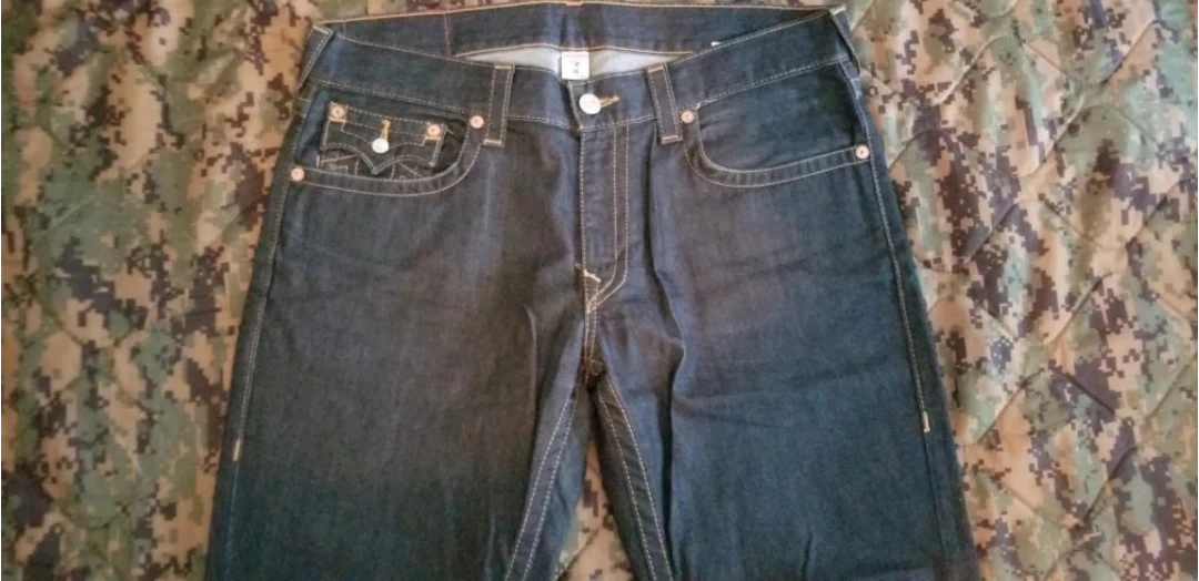 Two pairs of True Religion jeans, one blue and one black. Both are size 36. The blue pair has distressing and a patch on the knees. one like new one used heavier. pick up Broadview station or Shoppers-Canada Post around the corner