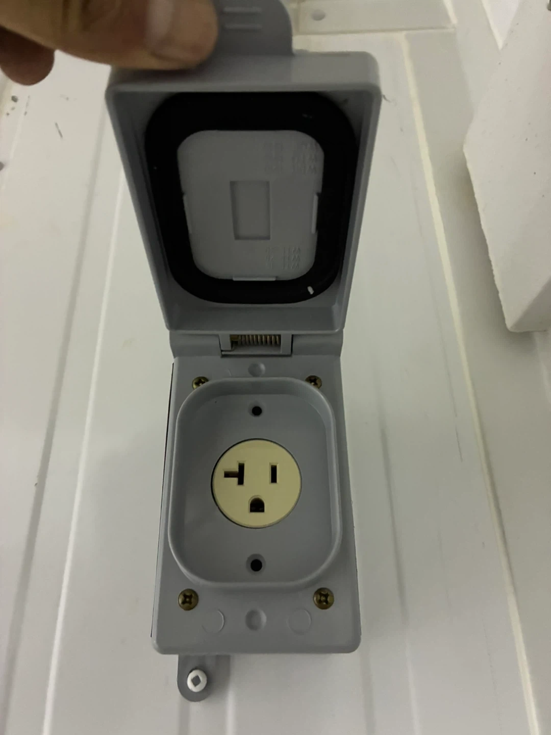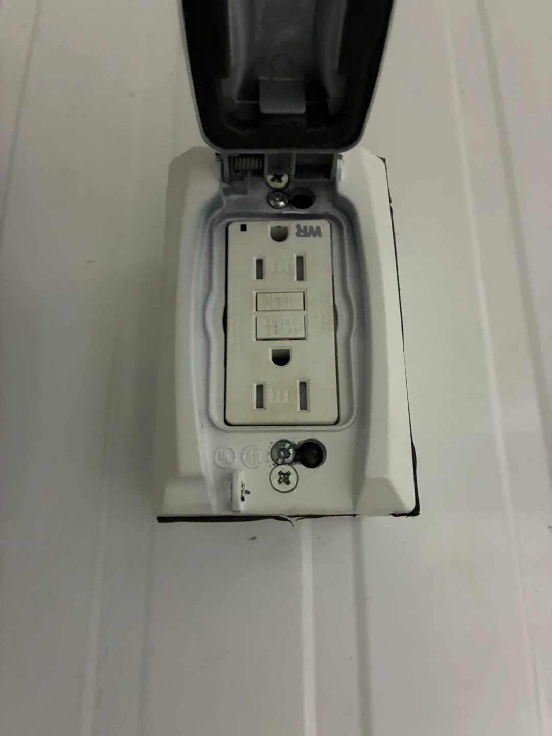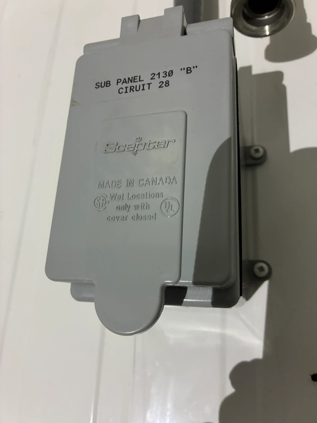 This is a Scepter brand outdoor GFCI duplex receptacle. It's made in Canada for wet locations and features a flip-up cover. This outlet is suitable for use where moisture is present.