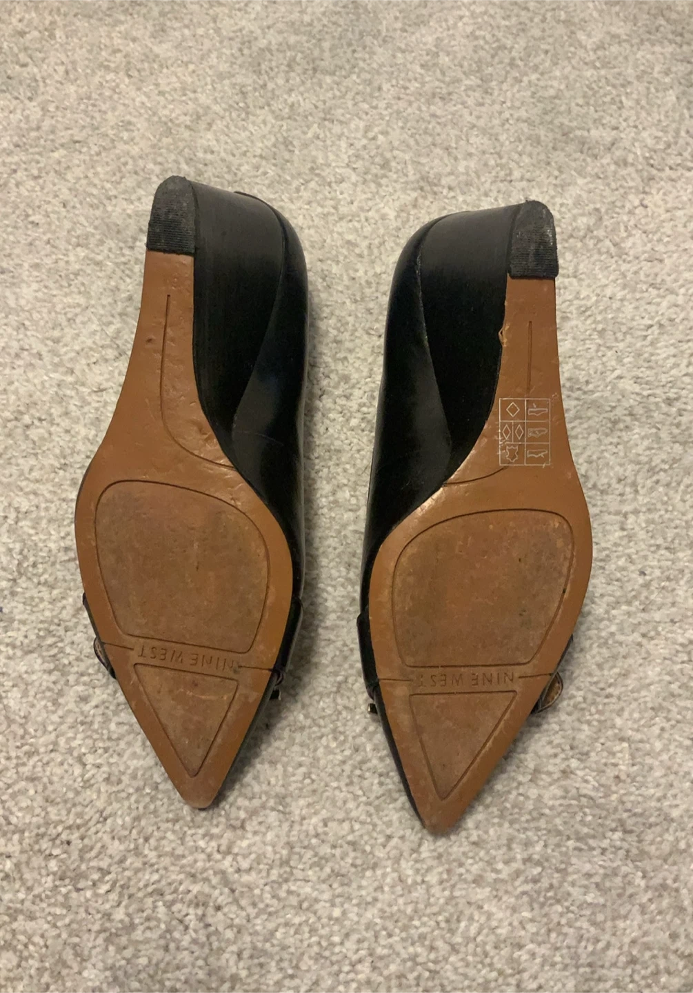 These Nine West wedge heels are black with a stylish gold buckle detail. They have a pointed toe and a comfortable wedge heel. Classic footwear for many occasions!