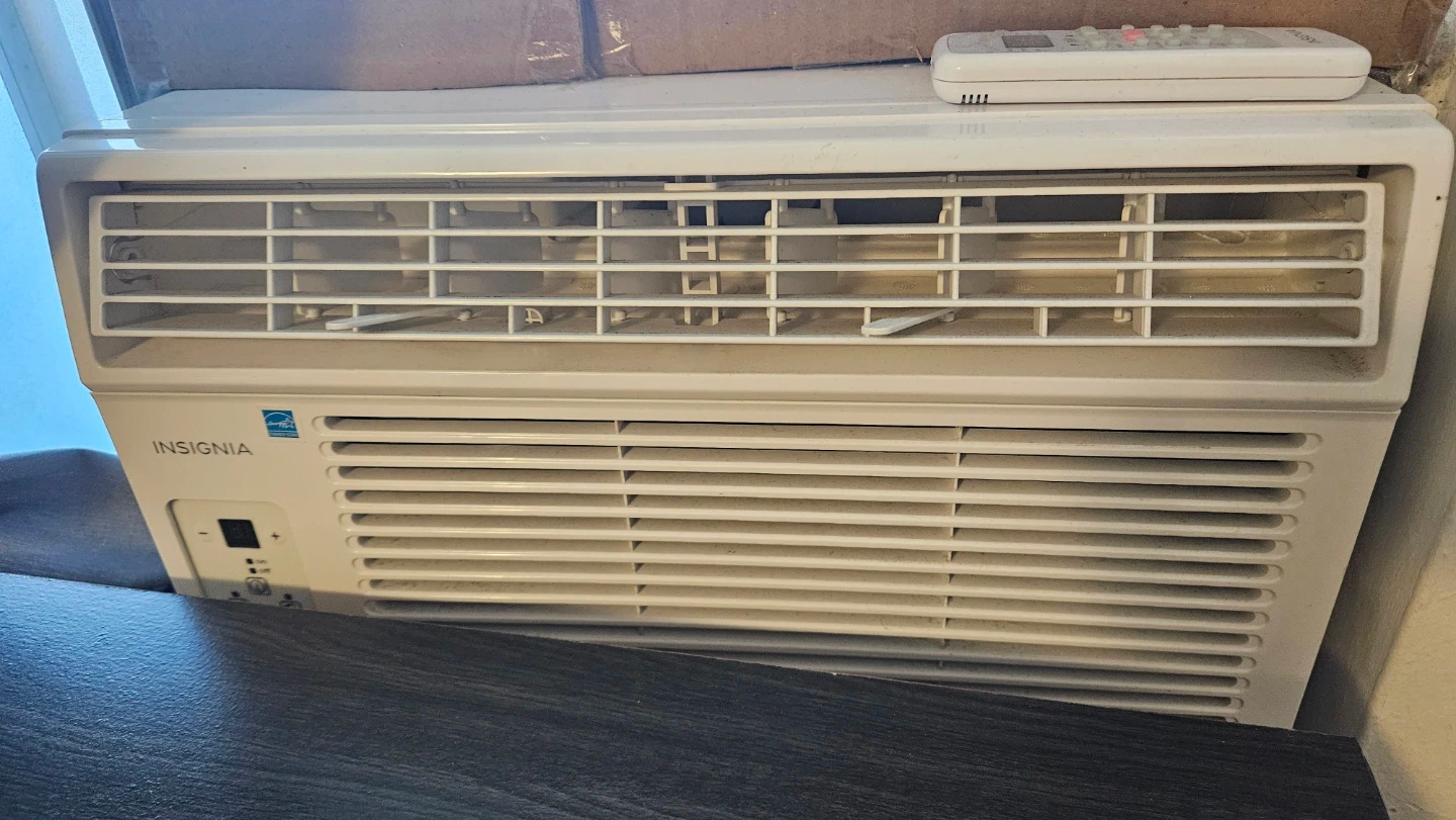 White Insignia window air conditioner. Includes remote control. It's a great unit for keeping a room cool. Unit is in good working condition. Likely 5000 BTU but dont remember now. Enough to cool a room.