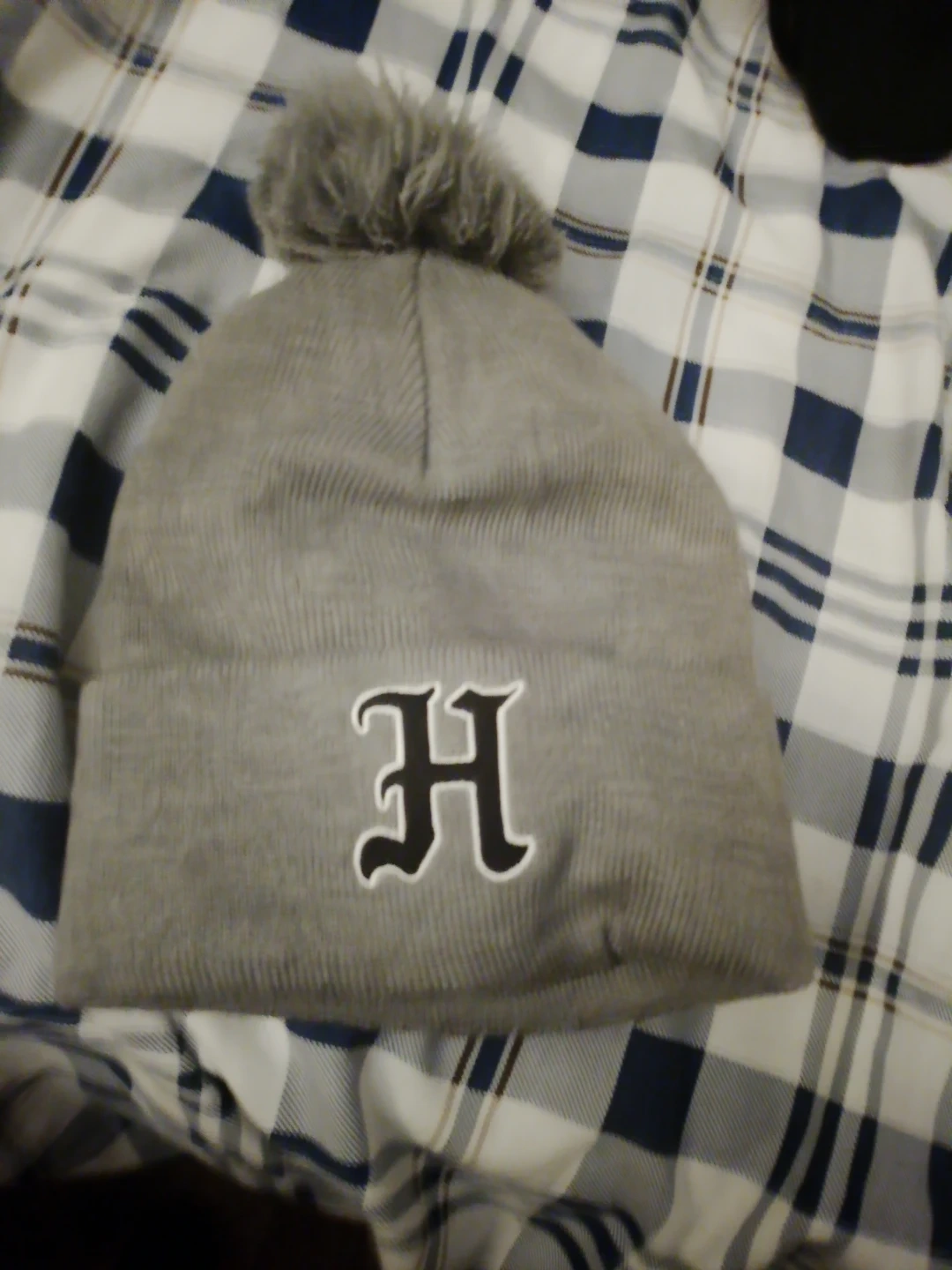 This is a cozy grey toque with a fluffy pom pom. It features a prominent black and white 'H' logo embroidered on the front. Made from a soft knit material, it's perfect for keeping warm on chilly days.