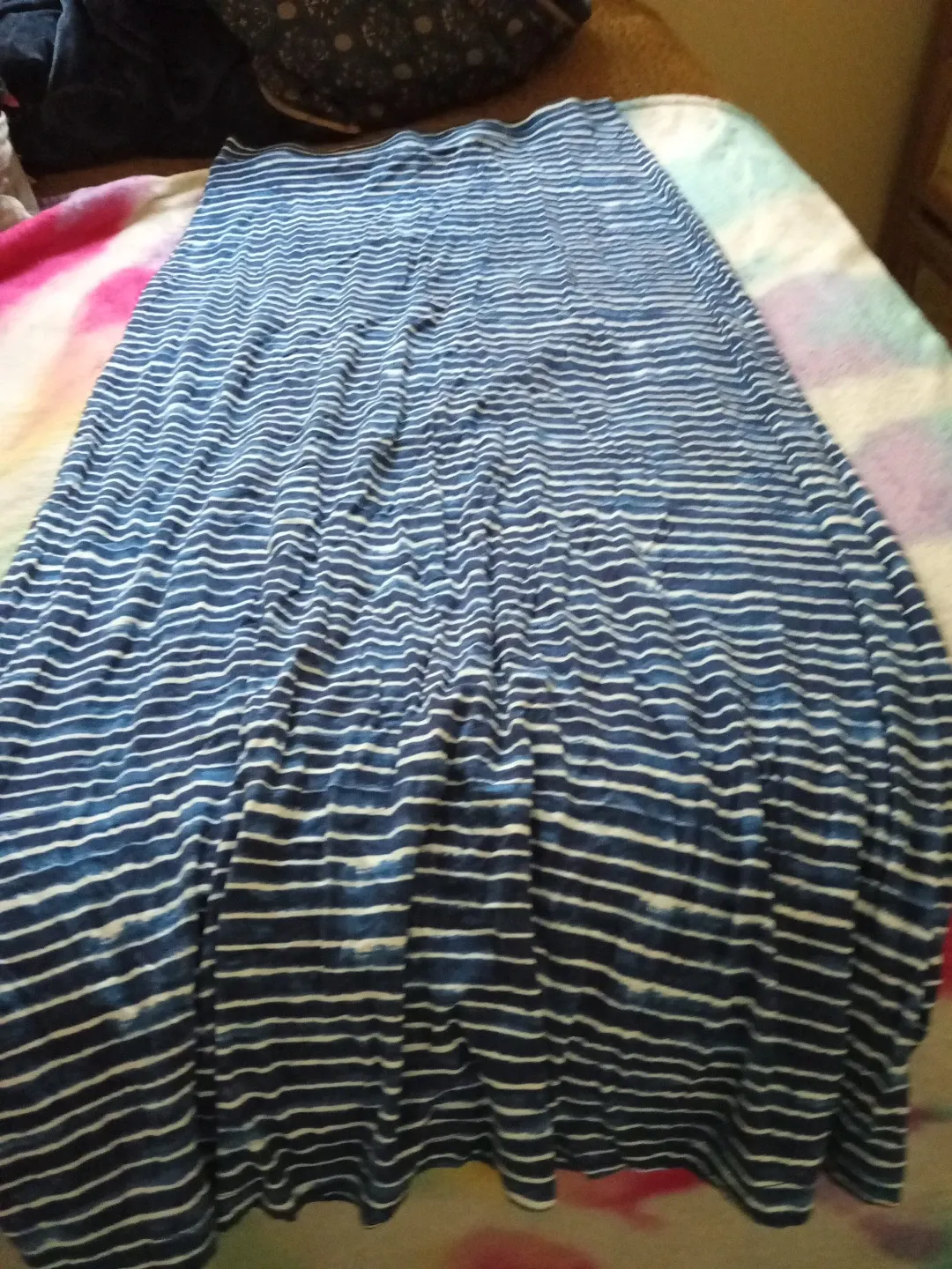 A comfy, flowy maxi skirt with a blue and white stripe pattern. It's made from a soft, stretchy material. This skirt is perfect for casual wear or dressing up!