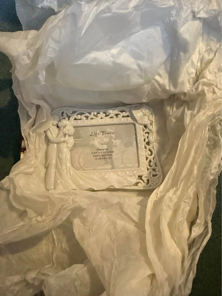 White ceramic wedding picture frame by Life Times. It fits a 4 3/4" x 3 1/4" (12 cm x 8.3 cm) photo.