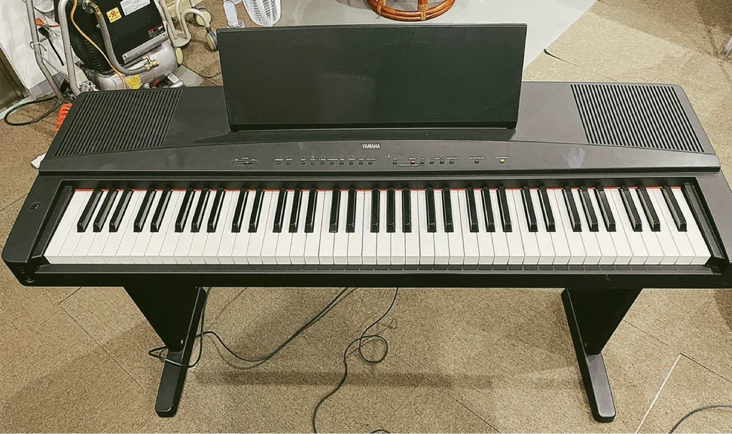 A Yamaha YPP-55 76 Keys semi-weighted digital piano. It offers various instrument sounds like piano, strings, and organ. Includes a music stand.