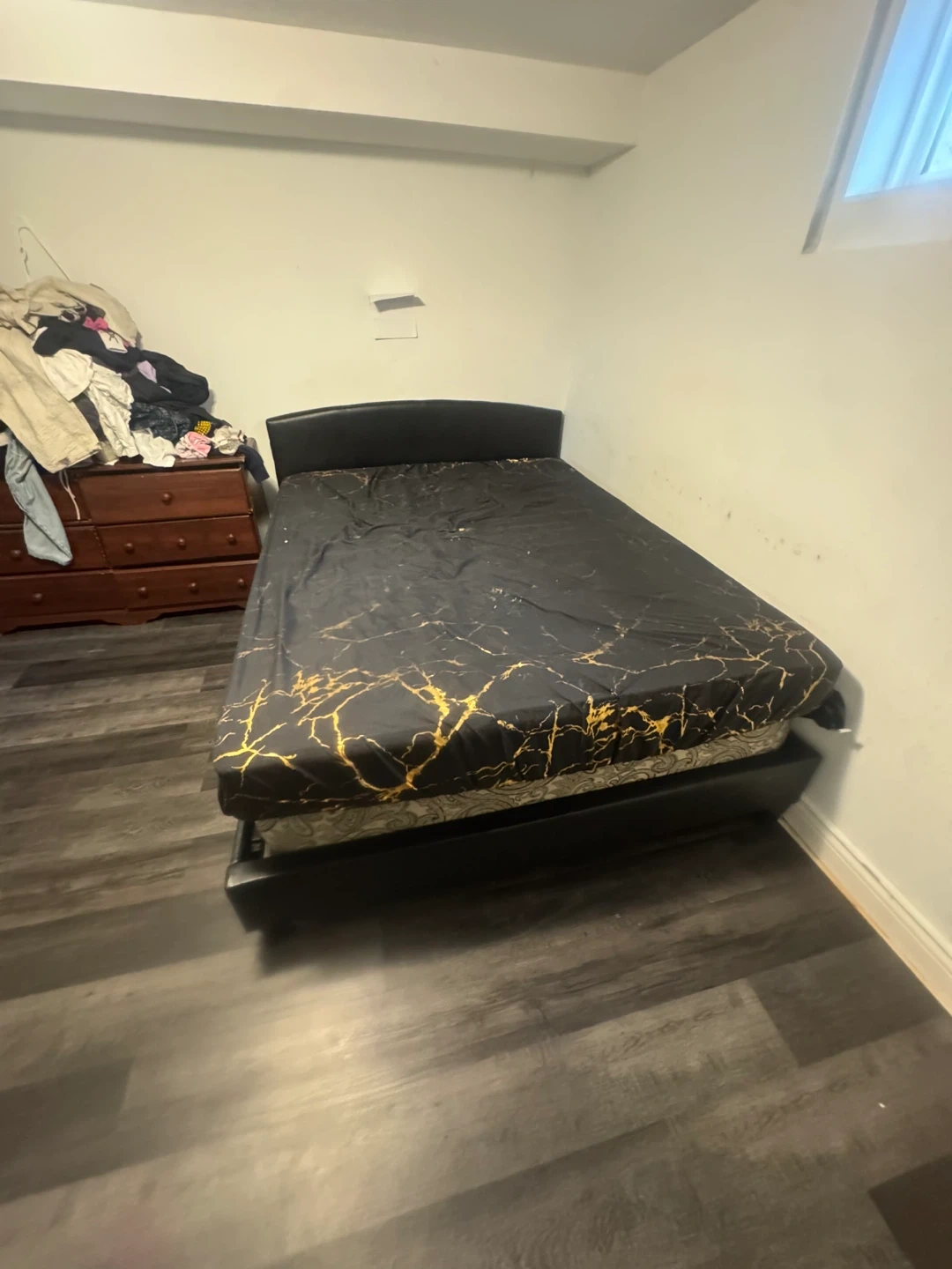 Queen size black faux leather platform bed frame with a headboard. Includes a fitted sheet with a black and gold marble pattern. Bed frame is sturdy and easy to assemble. Provides good support for the mattress.