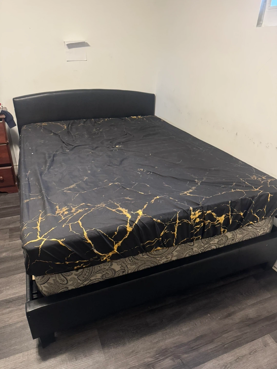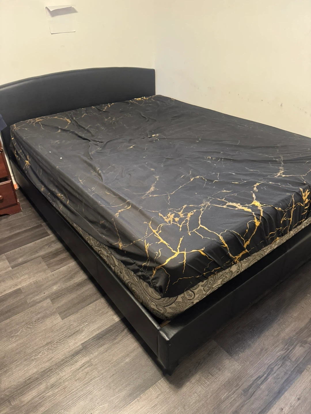 Queen size black faux leather platform bed frame with a headboard. Includes a fitted sheet with a black and gold marble pattern. Bed frame is sturdy and easy to assemble. Provides good support for the mattress.