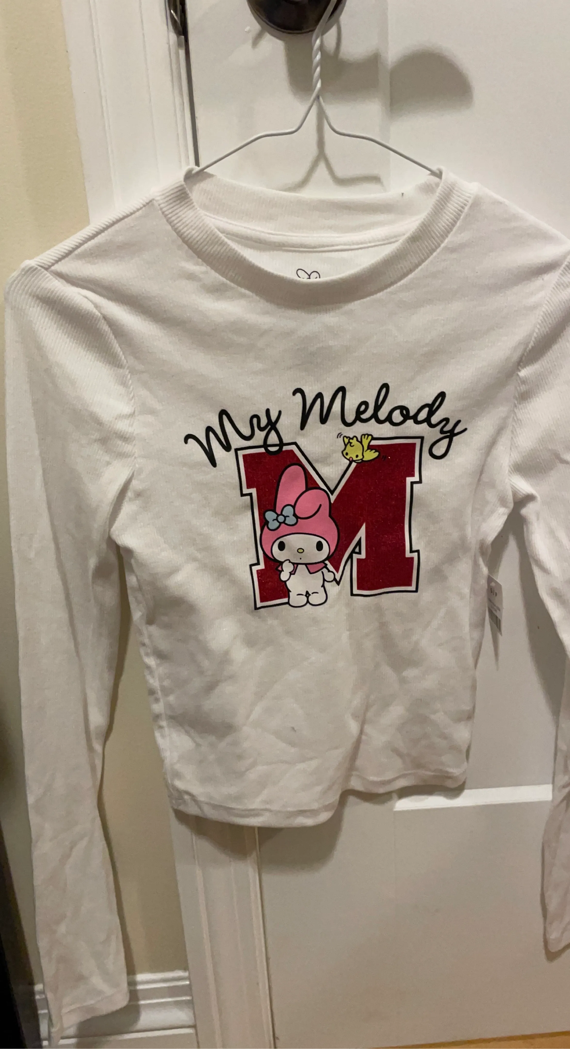 White long sleeve shirt featuring My Melody graphic. Ribbed neckline and cuffs. Made from a soft fabric blend.