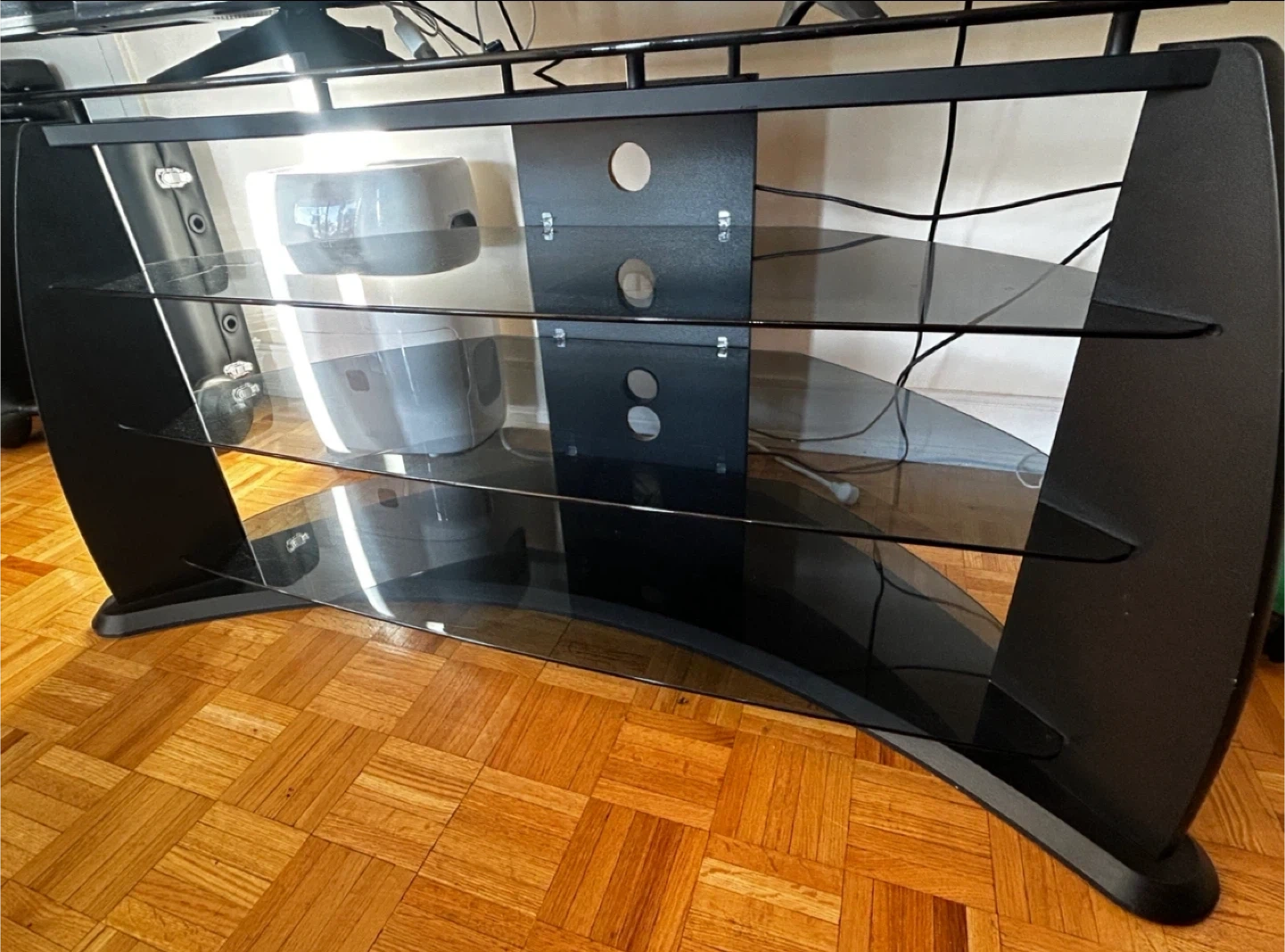 Modern black TV stand with tempered glass shelves. Strong and stylish design, perfect for a living room or bedroom. Features multiple glass levels for a TV, gaming consoles, cable box, or decorations. In good condition, clean and sturdy.