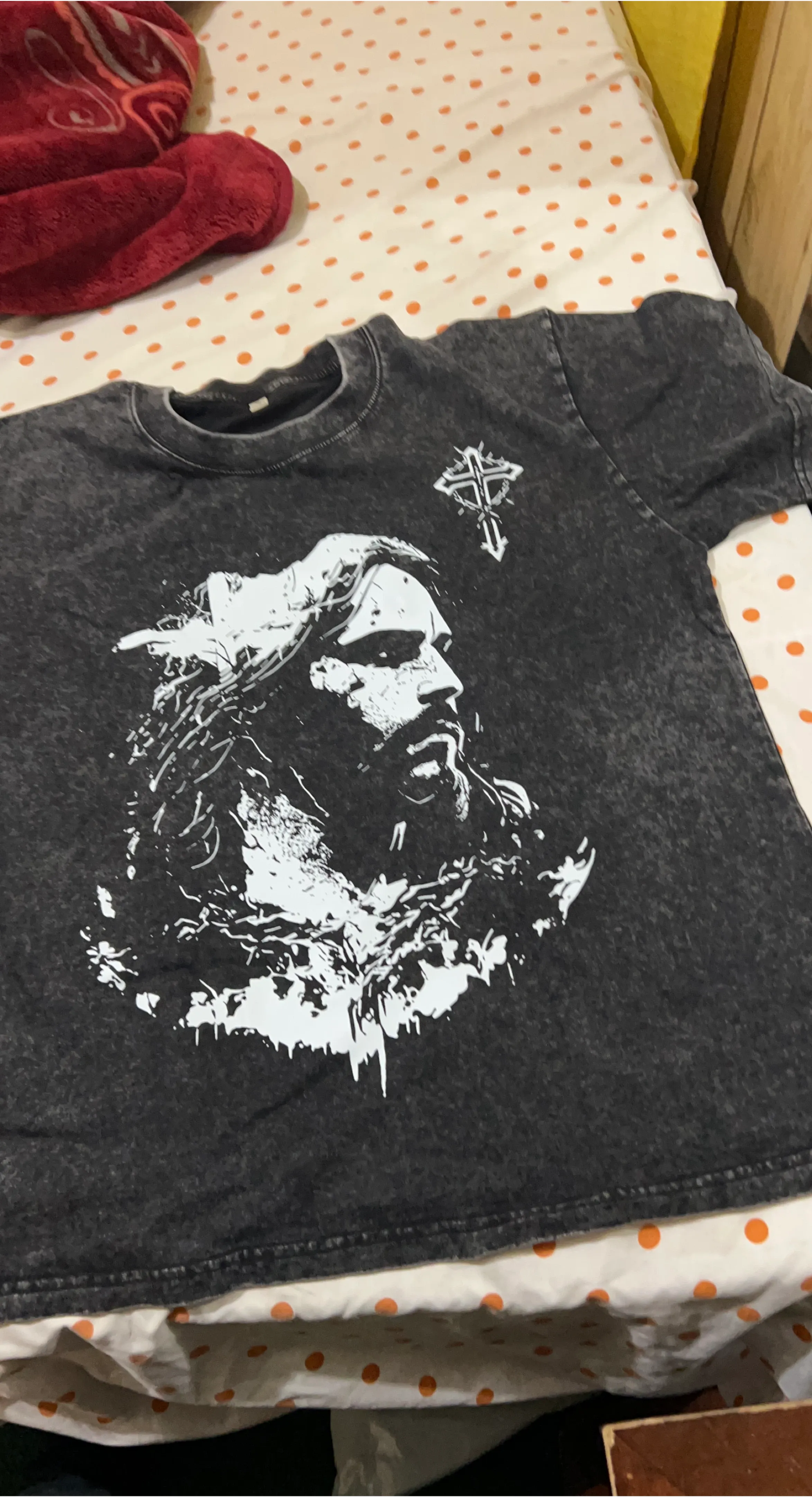 This is a dark gray t-shirt with a white graphic of Jesus and a cross. It's made of cotton. It's a crew neck style.