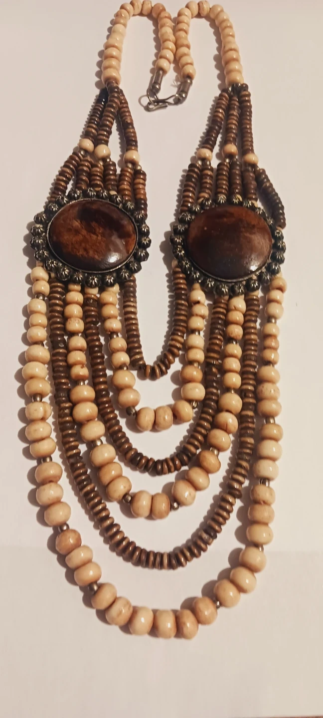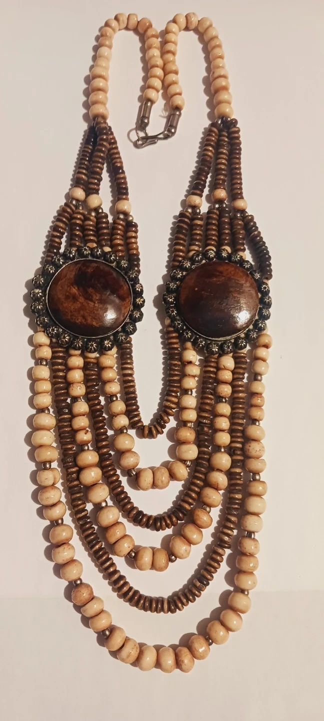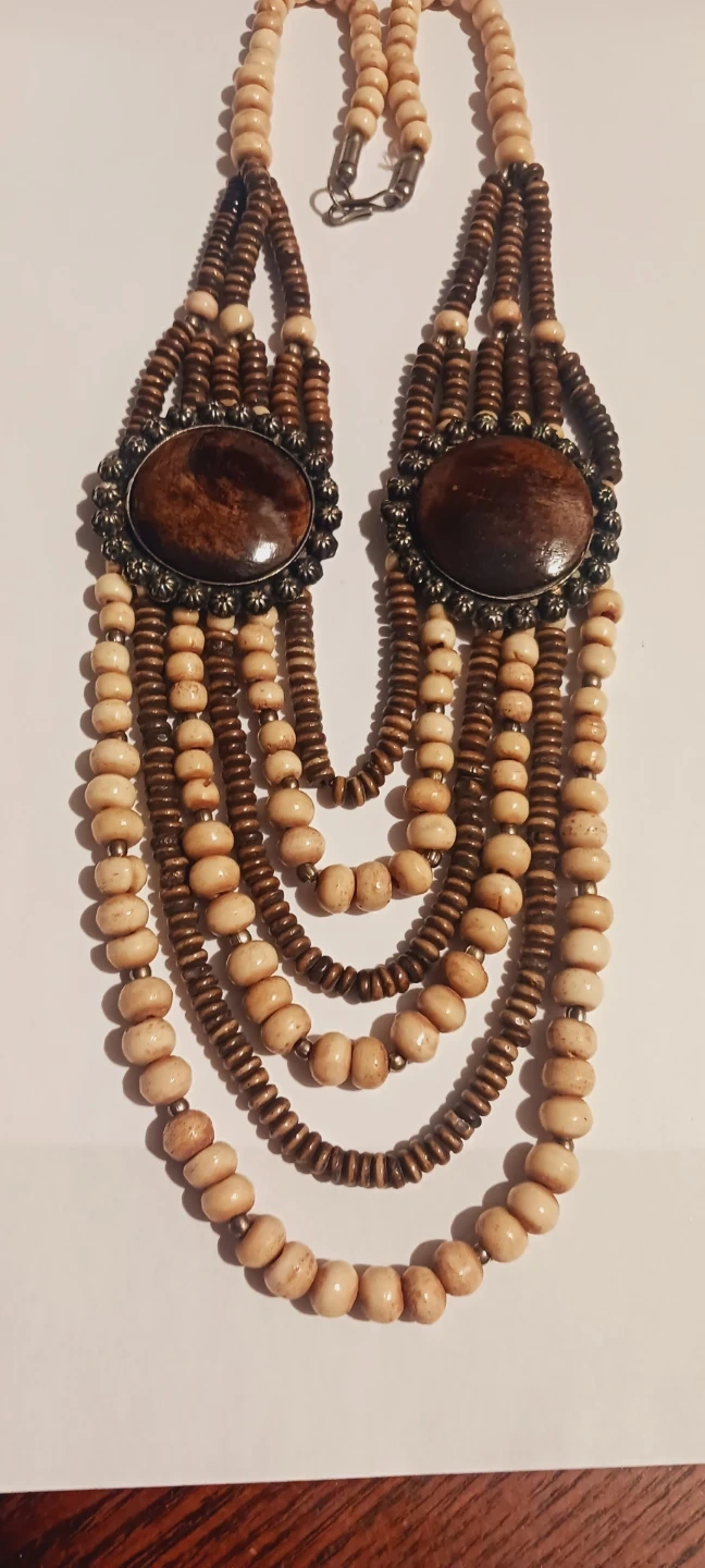 This multi-strand Bohemian Statement necklace features natural wood beads in light beige and dark brown. It has two central oval wooden pendants with antique-style metal frames. Fastens with a lobster clasp. Excellent condition.. 20" long. Excellent condition. ALL MY PRICES ARE NEGOTIABLE !!