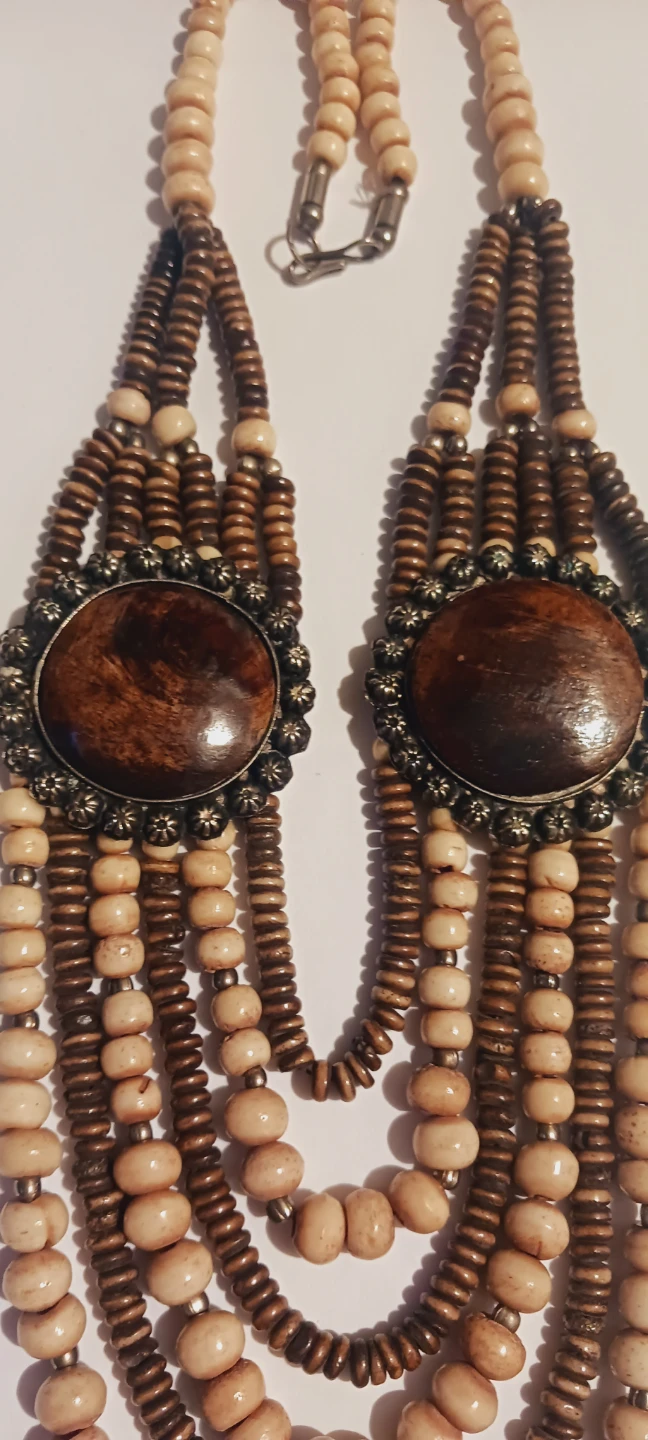 This multi-strand Bohemian Statement necklace features natural wood beads in light beige and dark brown. It has two central oval wooden pendants with antique-style metal frames. Fastens with a lobster clasp. Excellent condition.. 20" long. Excellent condition. ALL MY PRICES ARE NEGOTIABLE !!