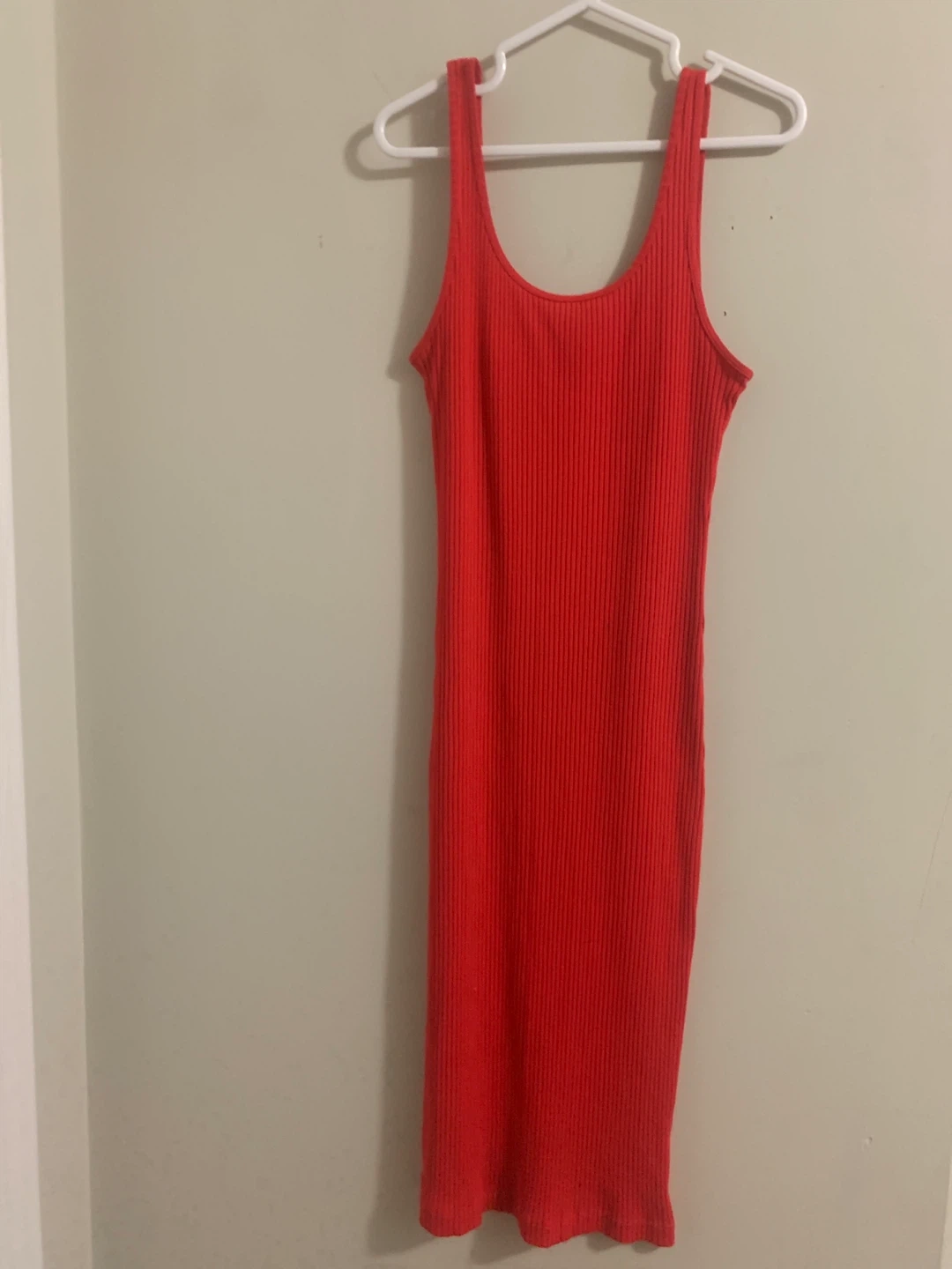 A cute red ribbed tank dress, perfect for summer! It's in great condition and ready for a new home. The material is soft and stretchy, making it super comfortable to wear. It's a versatile piece that can be dressed up or down, depending on the occasion