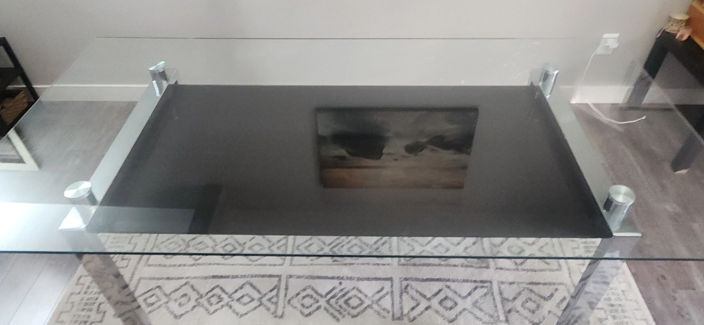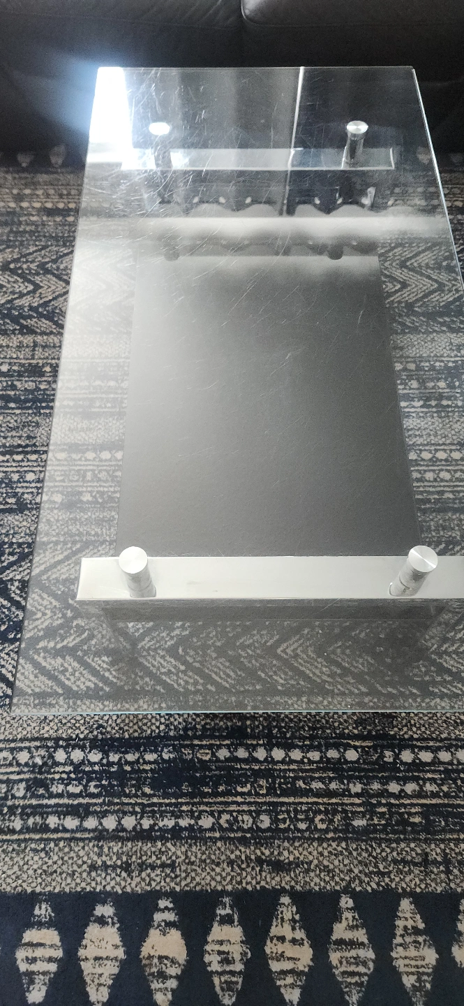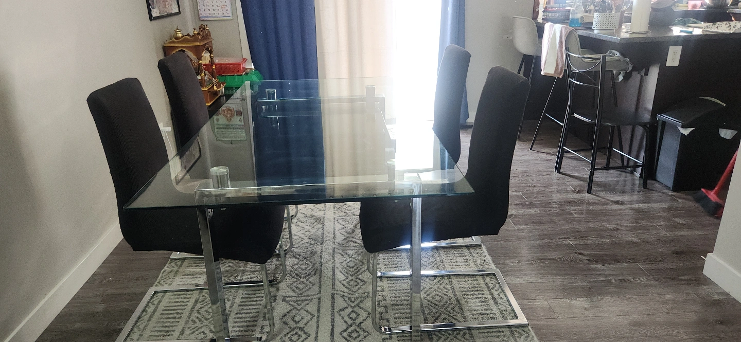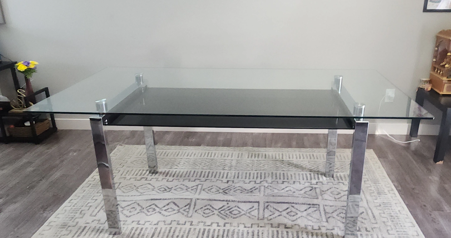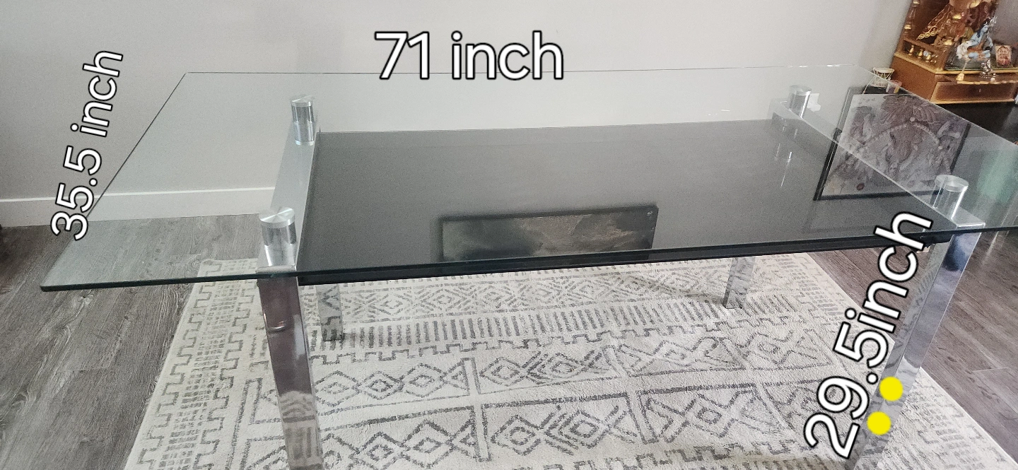 Large glass dining table. Chrome legs. Black tempered glass insert. 71 inches long, 35.5 inches wide. Some minor scratches on glass top.
