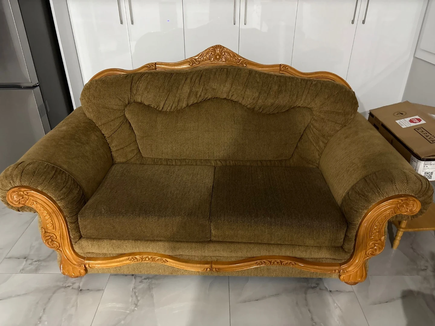 This elegant sofa features a comfortable cushioned seat and back with intricate tufting. It boasts ornate carved wood trim along the top and arms, adding a touch of classic style. The upholstery is a durable, textured brown fabric. Comes with two matching throw pillows. It's a substantial piece that would elevate any living space! 3 piece