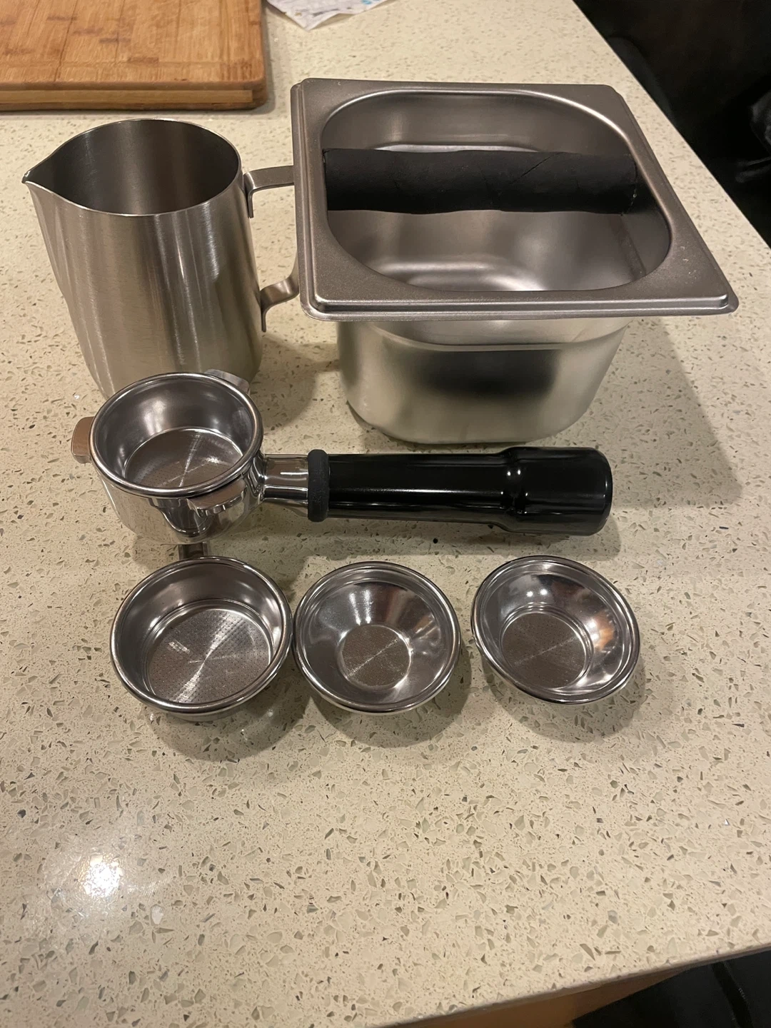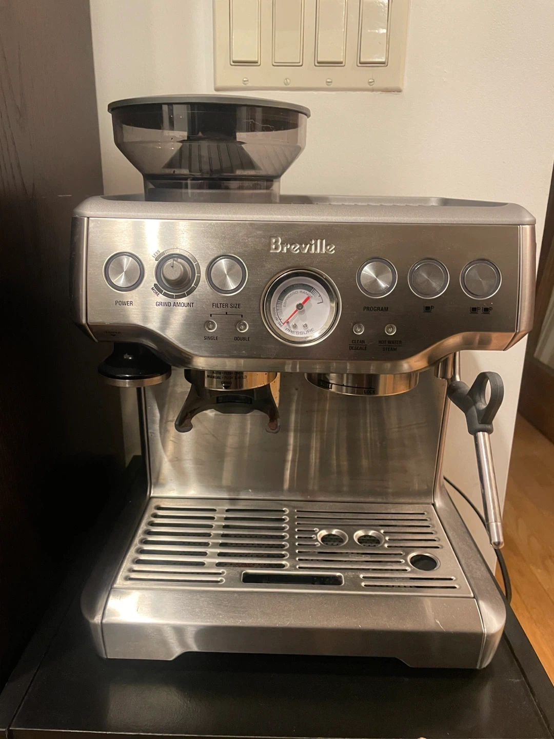 Breville Barista Express espresso machine with grinder and accessories. Includes portafilter, tamper, milk pitcher, and multiple filter baskets. Stainless steel construction. Barely used.