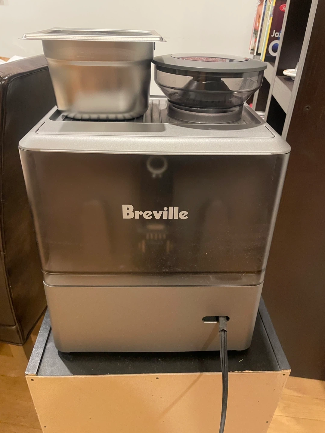 Breville Barista Express espresso machine with grinder and accessories. Includes portafilter, tamper, milk pitcher, and multiple filter baskets. Stainless steel construction. Barely used.