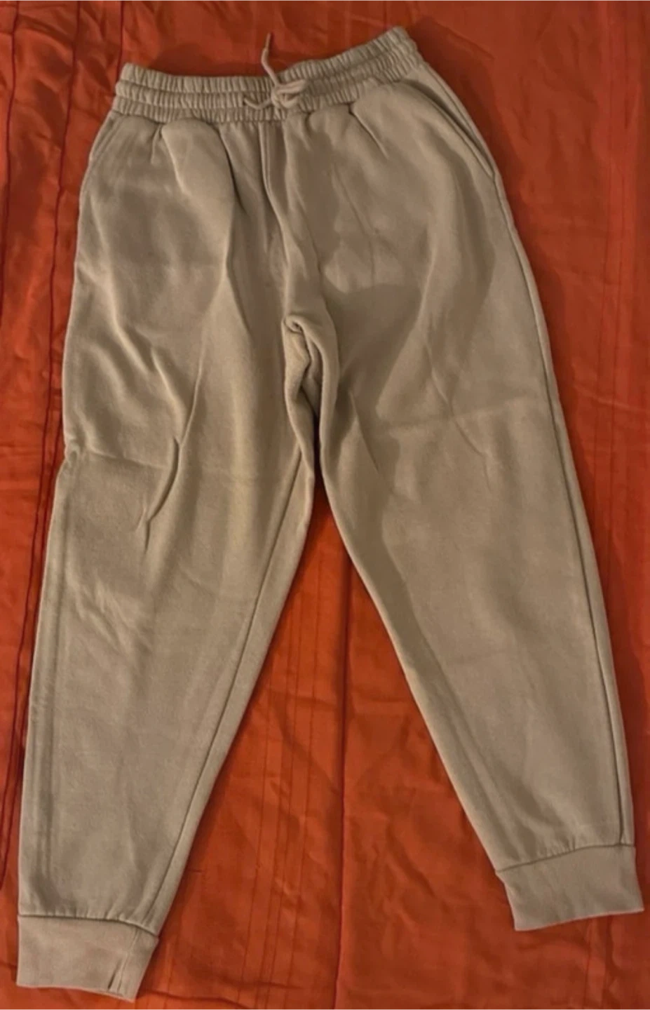 These are comfortable jogger pants in a light brown color. They feature an elastic waistband with a drawstring and cuffed ankles. The material feels like a soft cotton blend.