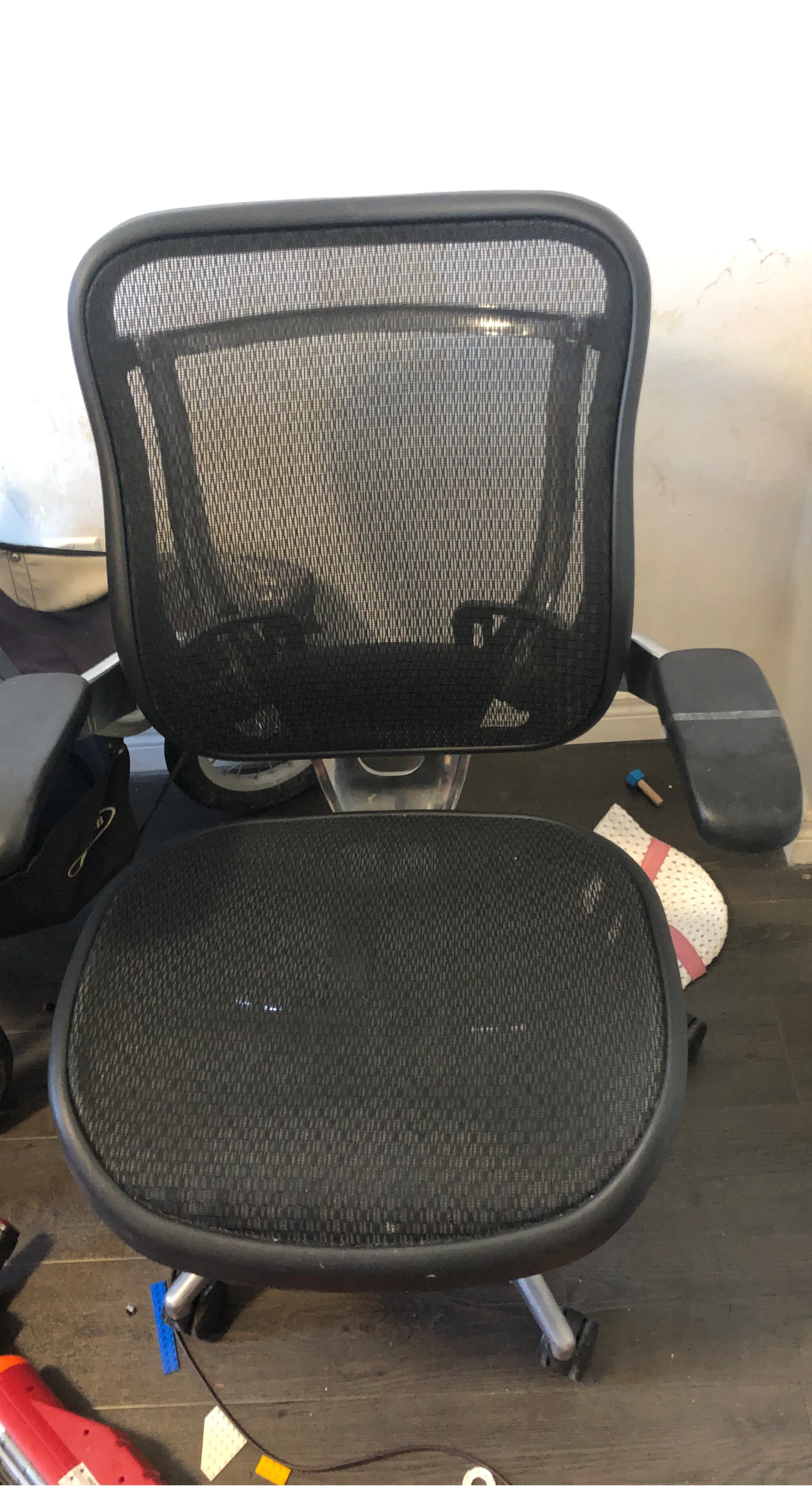 This ergonomic office chair offers mesh back support for breathability. It's designed for comfort during long work sessions. The chair has adjustable armrests and a swivel base with casters for easy mobility. This chair is great for home offices or commercial spaces.