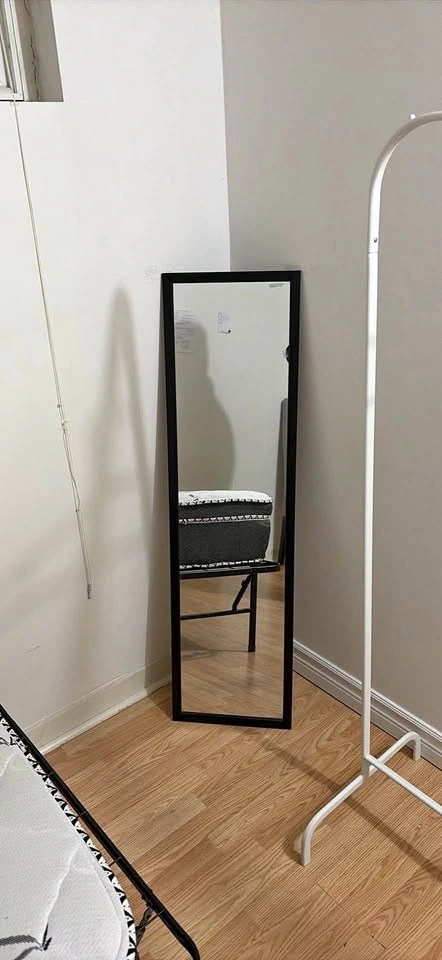 Clean full-length mirror with a slim black frame. The glass is clear with no cracks or chips. Its minimalist design works well for a bedroom or hallway.