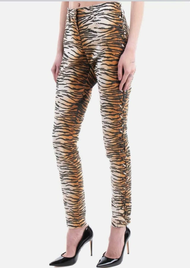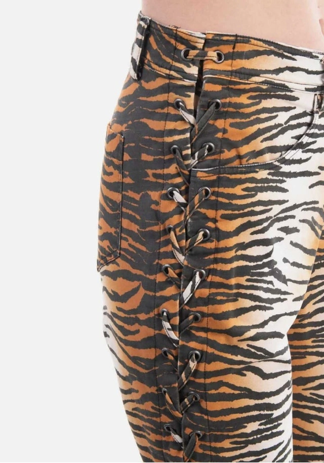 Add a fierce touch to your wardrobe with these A.L.C. tiger print pants. Made from 97% cotton and 3% elastane for a comfortable stretch fit, these unique pants feature stylish lace-up detailing on the sides and a skinny fit that's sure to turn heads. Key Features: Material: 97% Cotton, 3% Elastane, Print: Tiger, Detailing: Lace-up sides, Fit: Skinny. Size: Small (4-6).