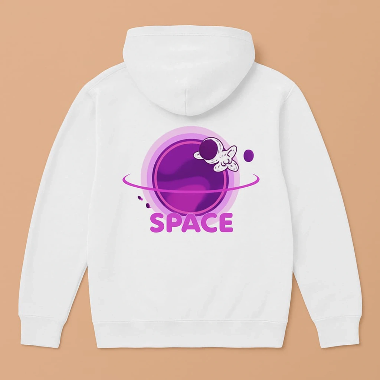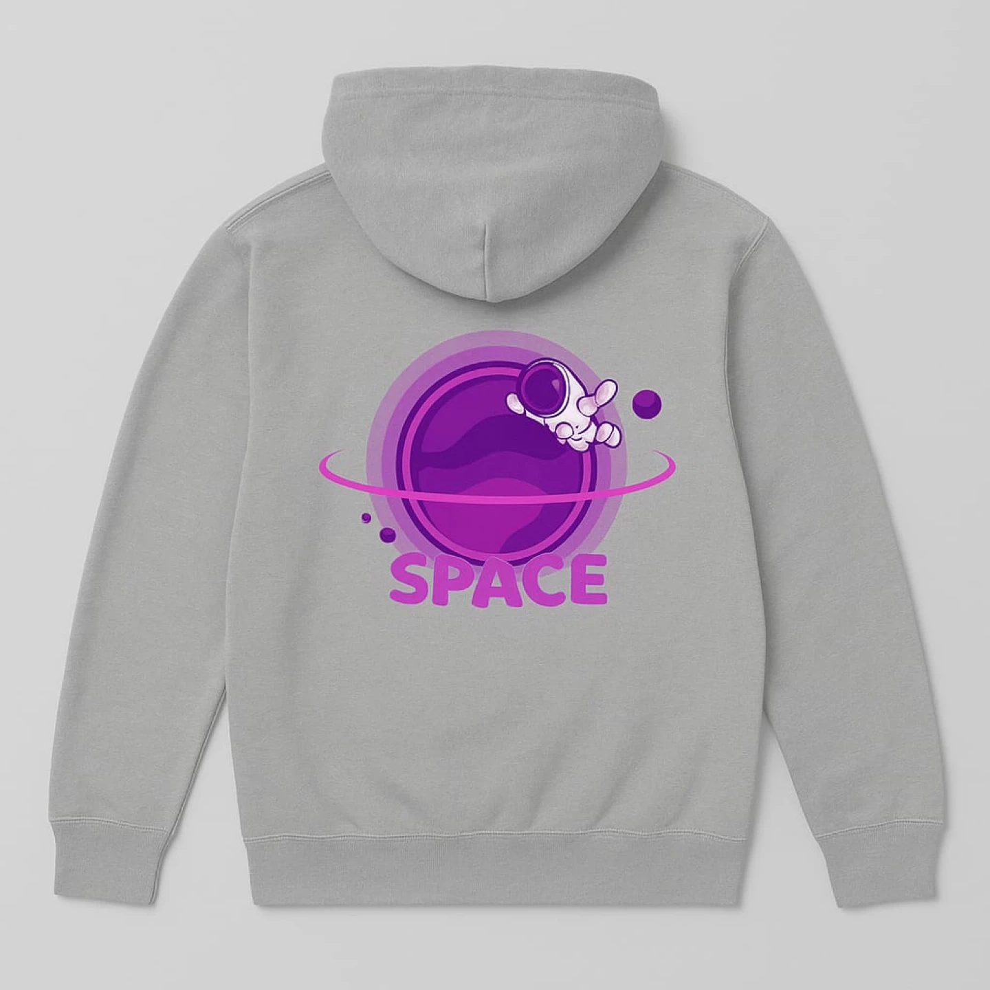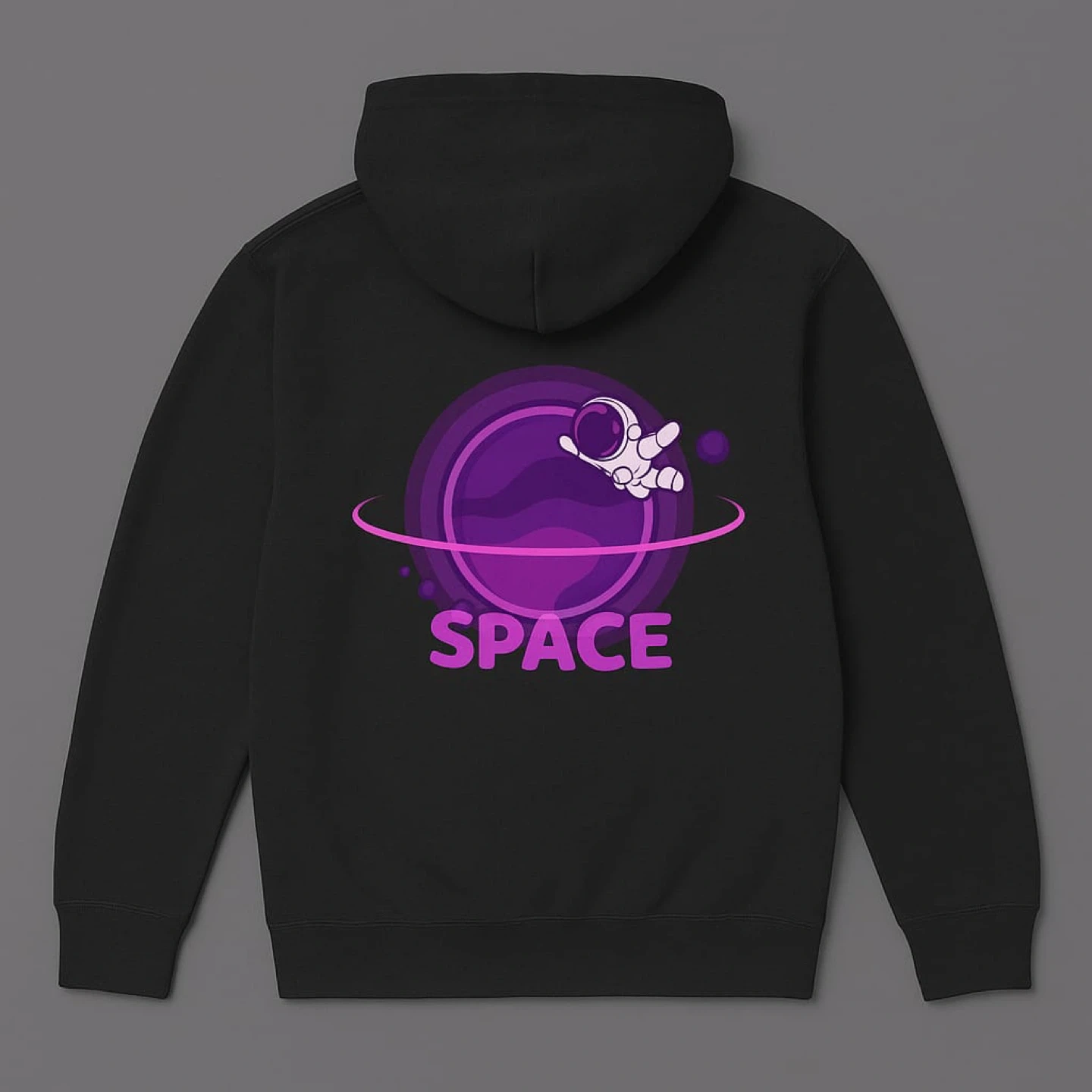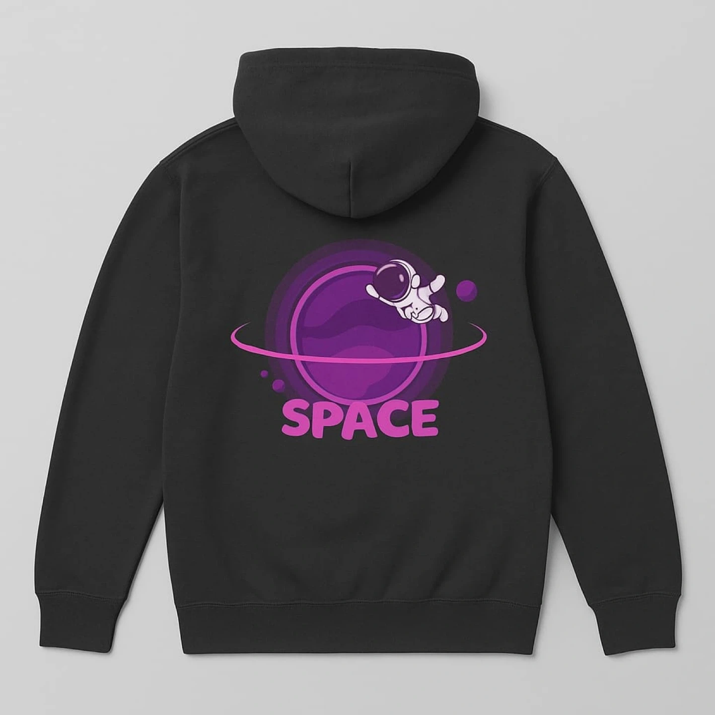 Here's a hoodie with a space-themed print on the back! It features an astronaut and a planet, with the word 'SPACE' printed below. Available in a range of colours.
