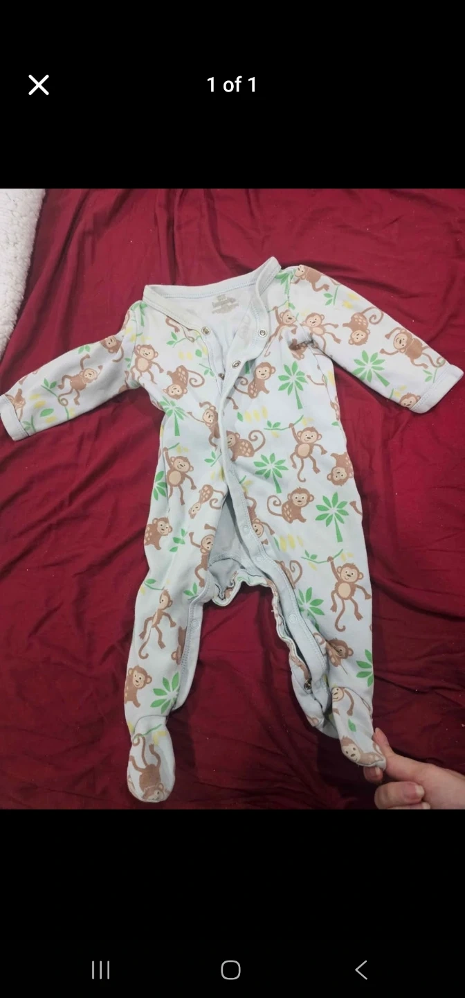 Soft, light blue baby pajamas with a cute monkey and palm tree print. Features a snap closure down the front and includes footies. Made from a comfy fabric for little ones. Perfect for naptime or bedtime!