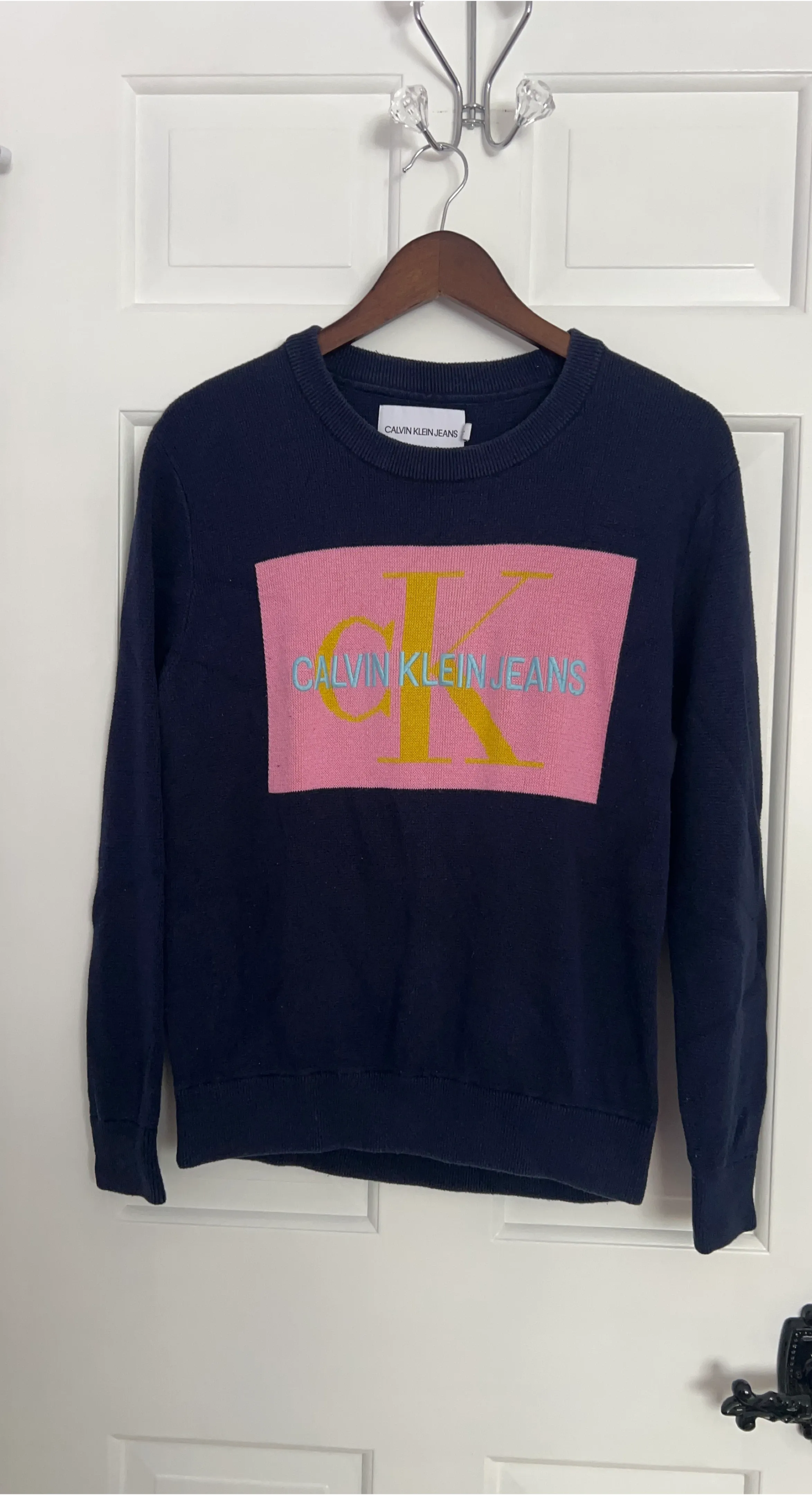 Calvin Klein Jeans navy blue crewneck sweater with a large pink rectangle logo featuring yellow and blue "CK" and "CALVIN KLEIN JEANS" text. It's a stylish knit for everyday wear. Material is soft and comfortable.