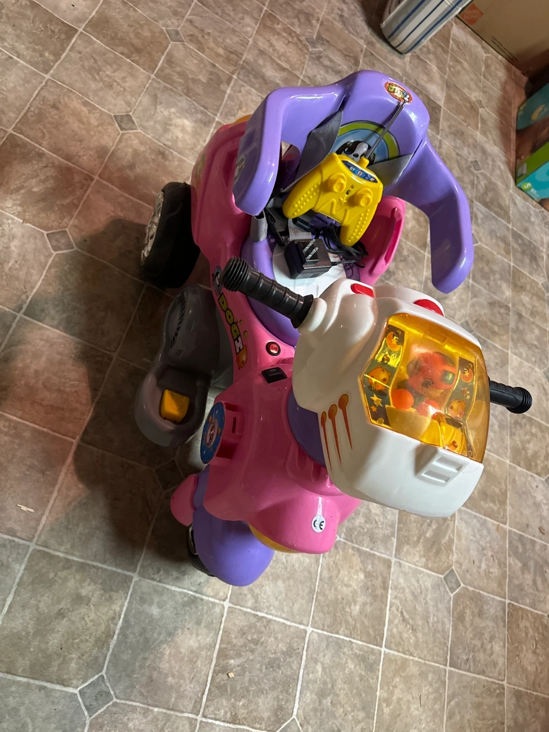 This pink ride-on toy dog vehicle is designed for little ones. It includes a yellow remote control for added play. It's suitable for young children's entertainment.