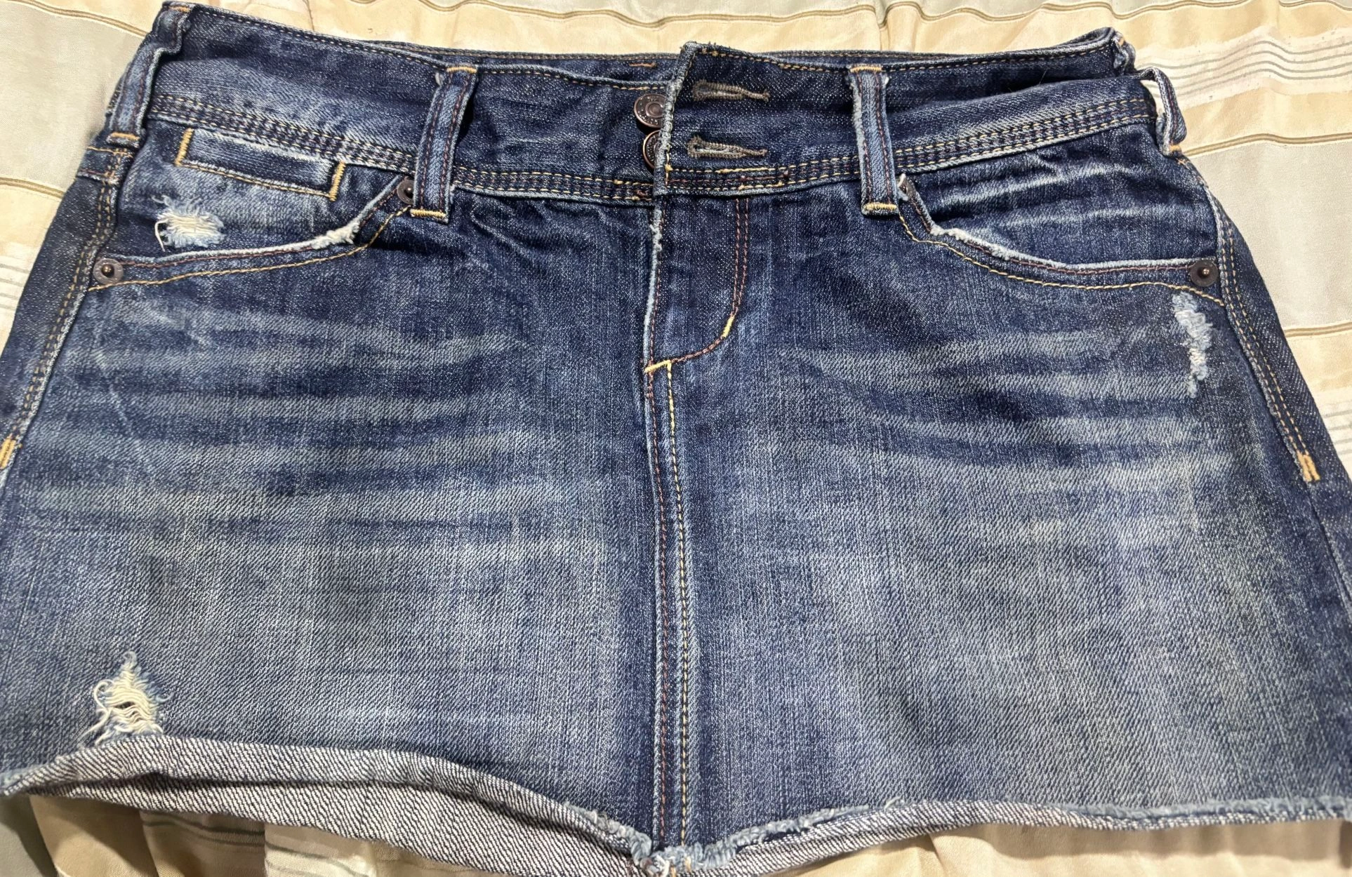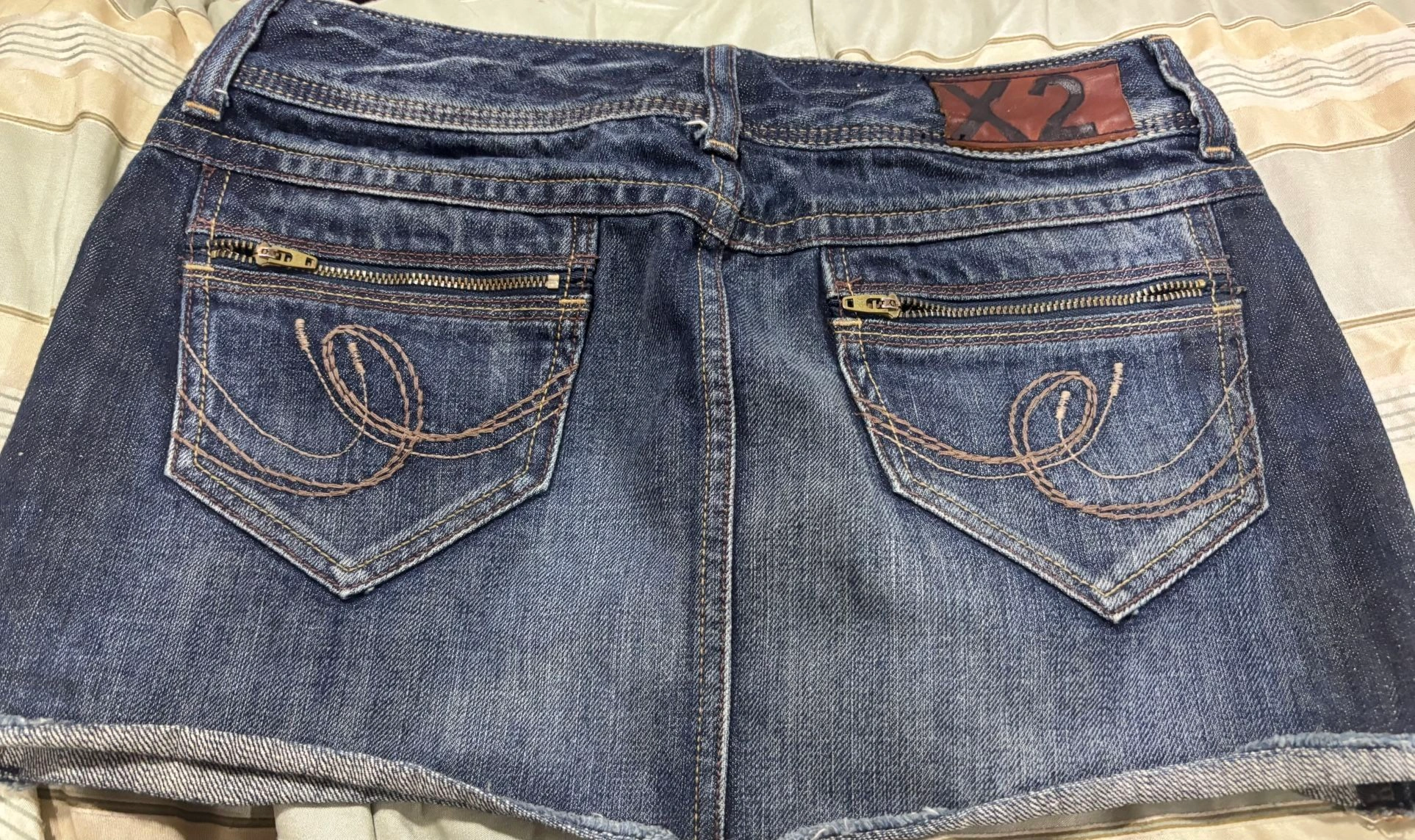 Authentic X2 denim micro mini skirt featuring classic early-2000s Y2K styling. This skirt has a vintage wash, intentional distressed details, and standout back zipper pockets — a signature detail that defines the era.
