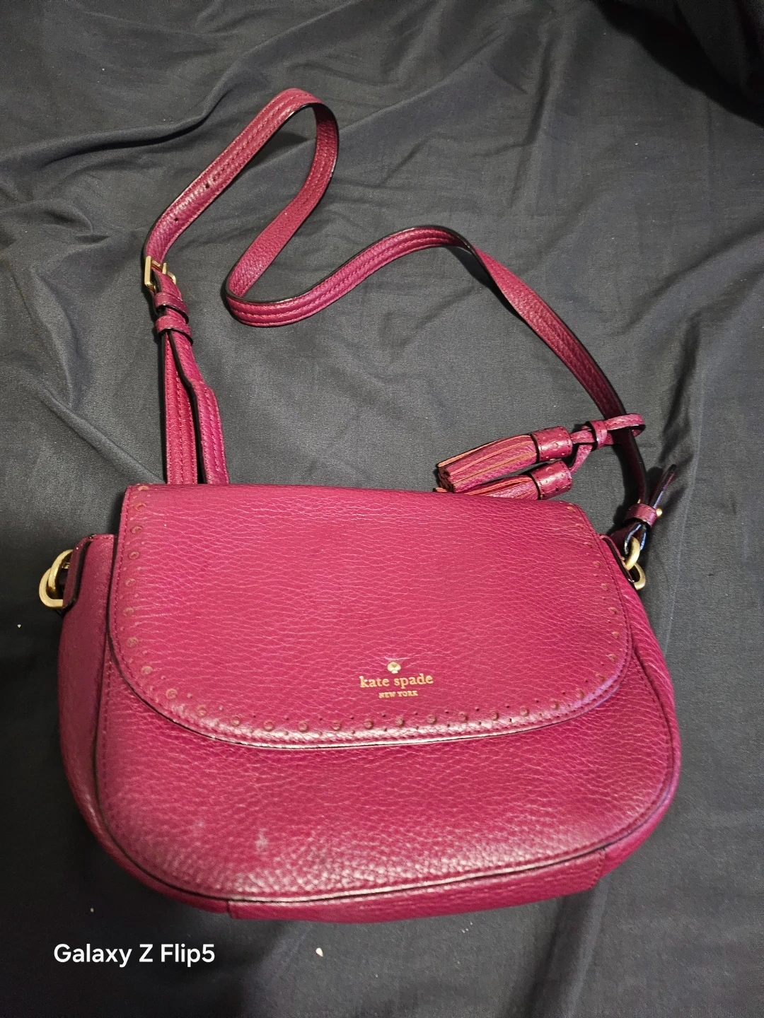 Selling a Kate Spade crossbody bag in a beautiful burgundy colour! It's in great condition and perfect for everyday use. The bag features a zip closure pocket inside and a stylish tassel detail. It's the perfect size to carry your essentials!