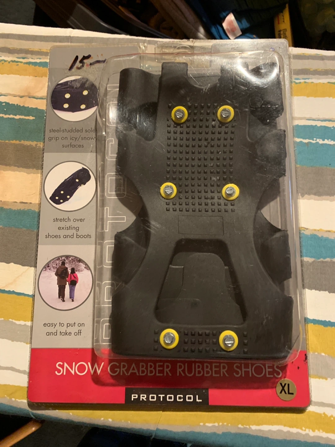 Protocol Snow Grabber Rubber Shoes in XL size. These feature steel-studded soles for grip on icy or snowy surfaces. They stretch over existing shoes and boots and are easy to put on and take off. Excellent for winter walking!