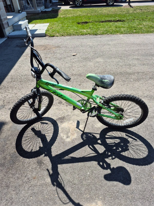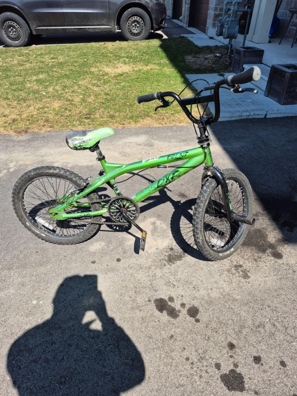 Selling a green DK bike, BMX style. It has some wear and tear on the seat, but otherwise it's in good condition for riding around the neighbourhood or practicing tricks