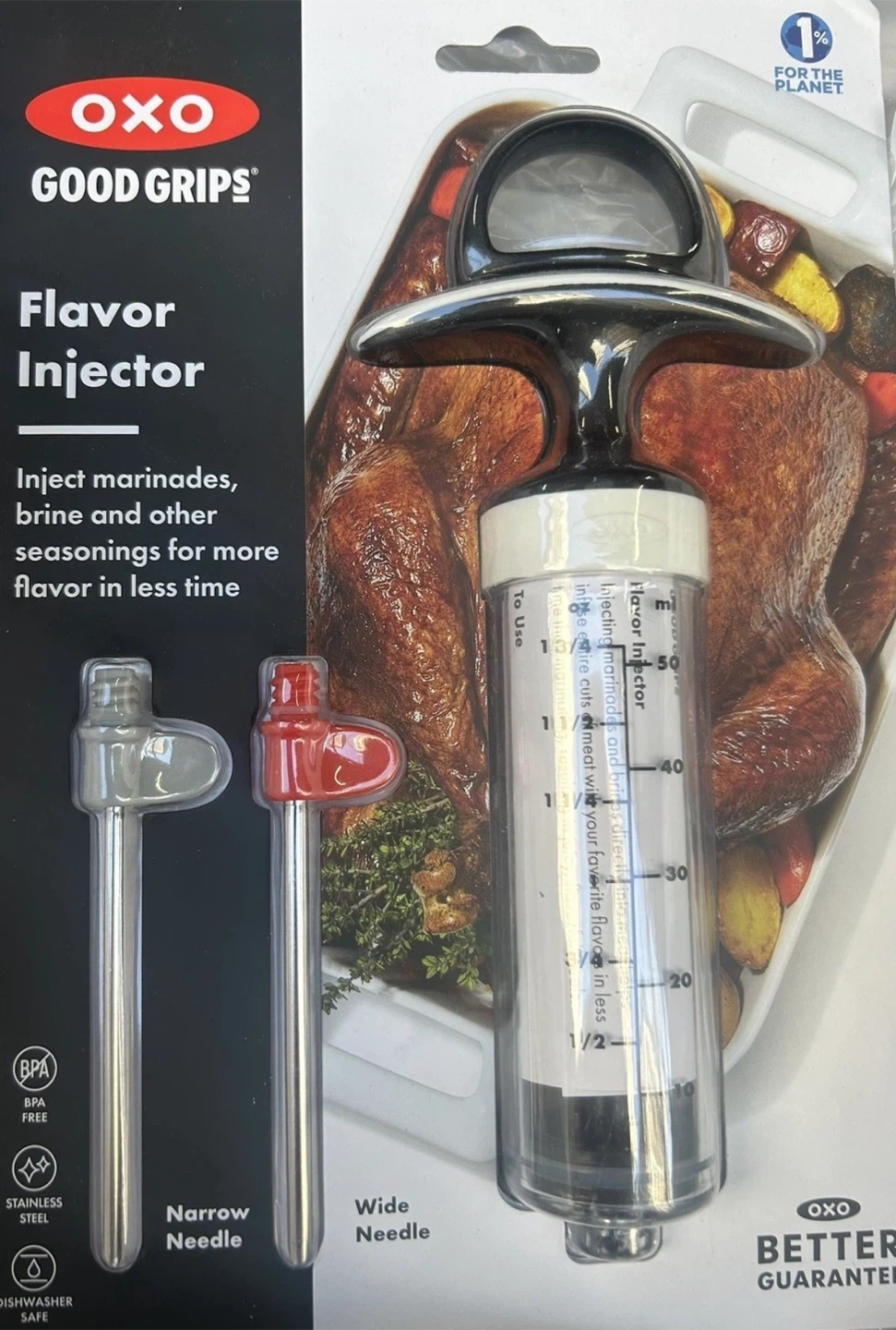 This OXO Good Grips Flavor Injector comes with two needles, a wide one and a narrow one, for injecting marinades and brines into meats. It's made of stainless steel and is BPA-free. It's also dishwasher safe for easy cleanup!