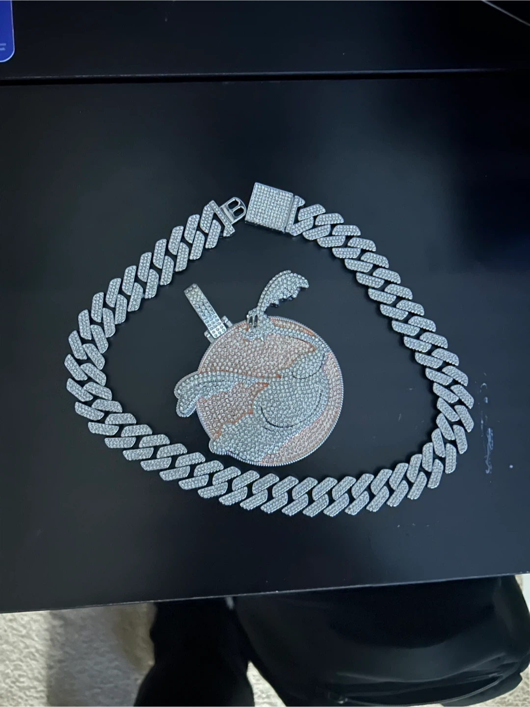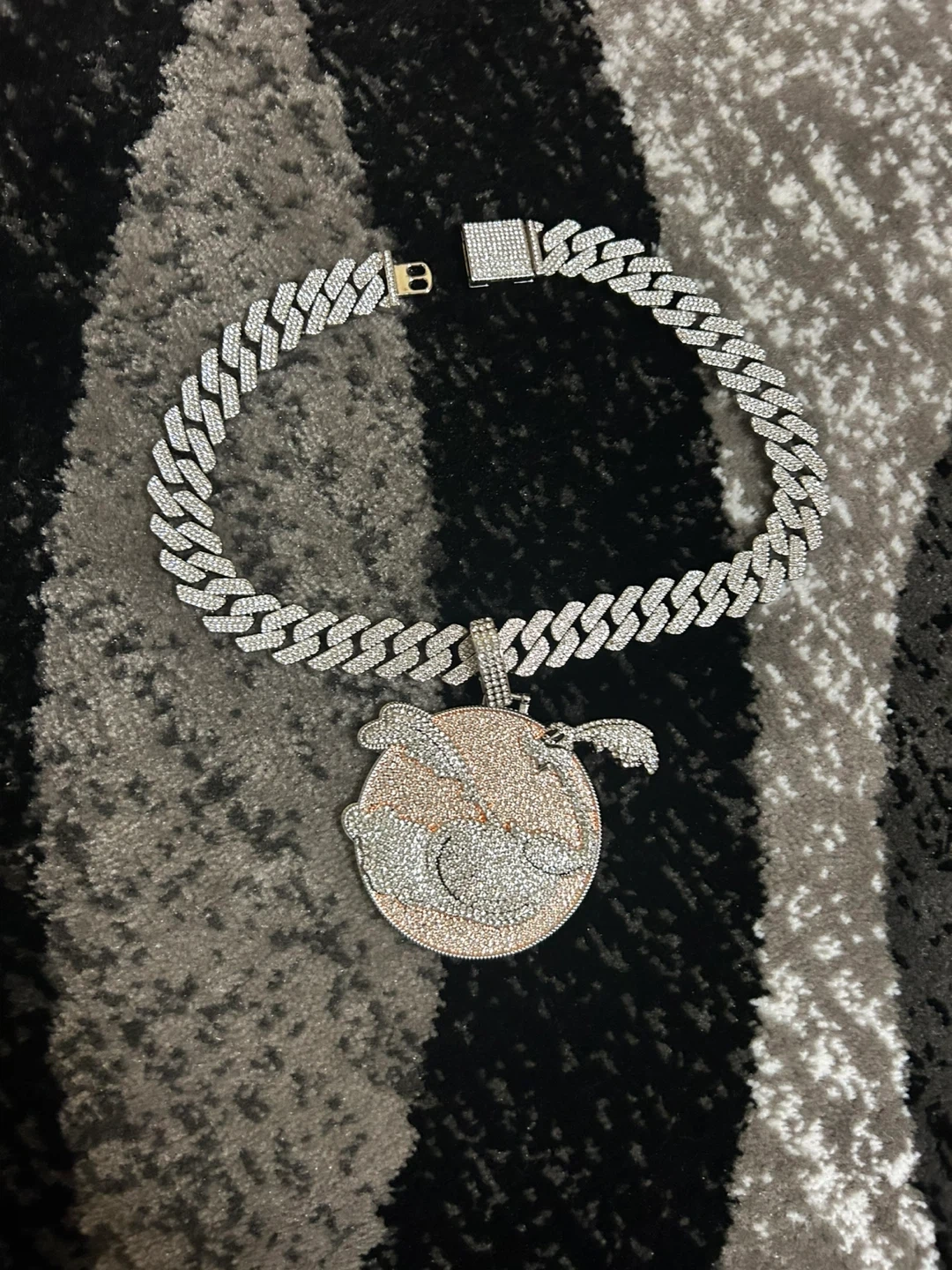 This is a blinged-out chain necklace featuring a unique Bunny charm. The chain and charm are covered in sparkling stones. It's a statement piece that's sure to turn heads!