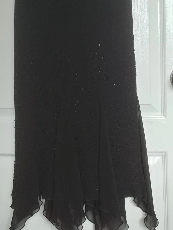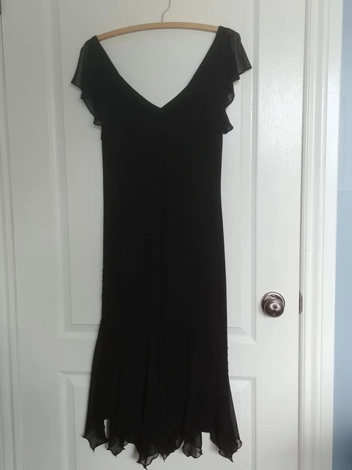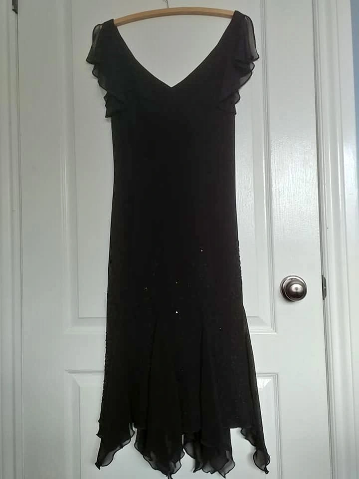 Beautiful black Bellesa cocktail dress, worn once, very elegant. Features pretty sheer chiffon flutter sleeves and sheer handkerchief details at the hemline. The lower half of the front is beaded from just below the waist to the hemline. This dress is stunning. Hidden side zipper.
