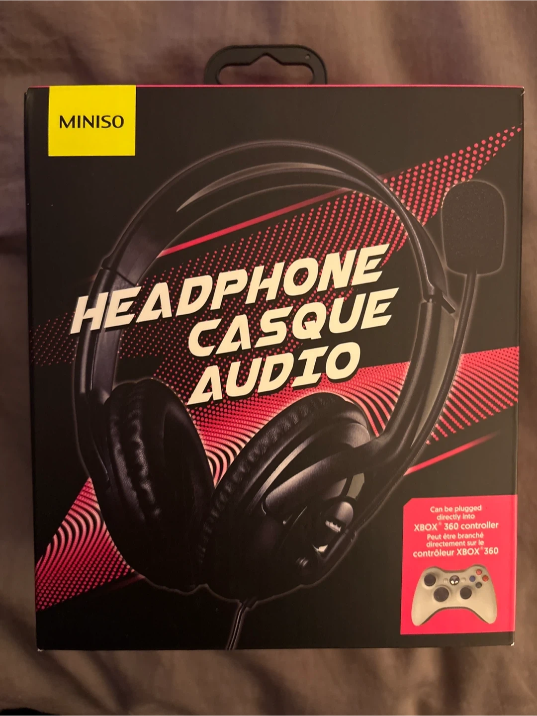 This is a MINISO headset designed for Xbox controllers. It features a flexible microphone and adjustable headband for comfort. The cord is 1.2 meters long.