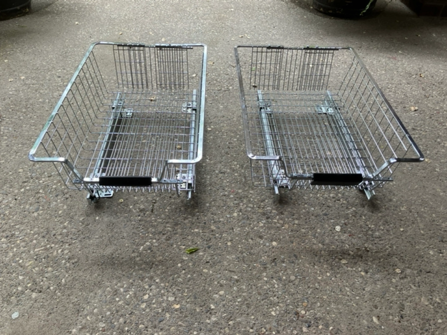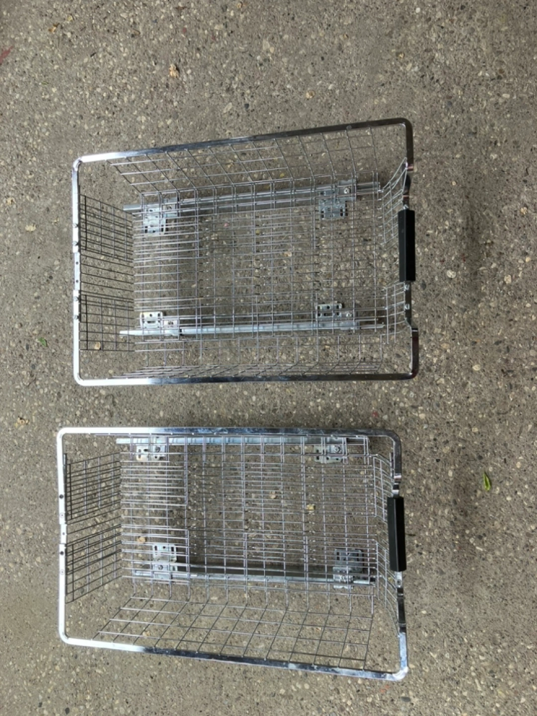 Chrome wire basket drawers. Bottom mount. Adjustable width. Two available. Useful for kitchen or bathroom storage.