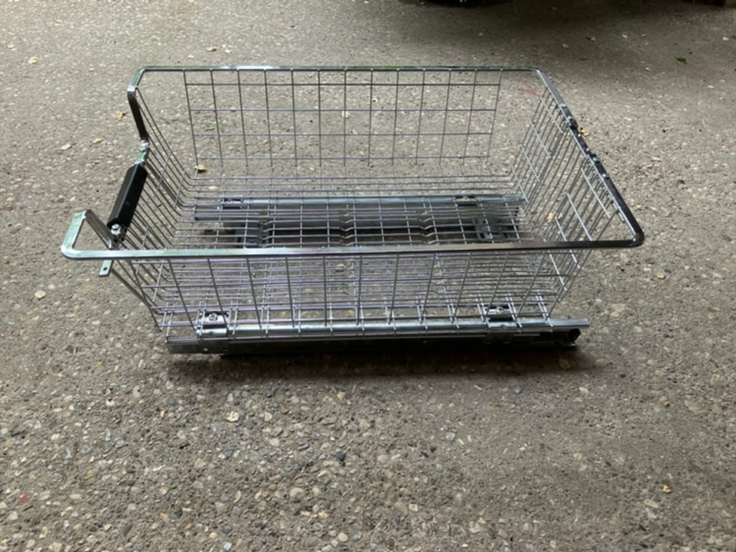 Chrome wire basket drawers. Bottom mount. Adjustable width. Two available. Useful for kitchen or bathroom storage.