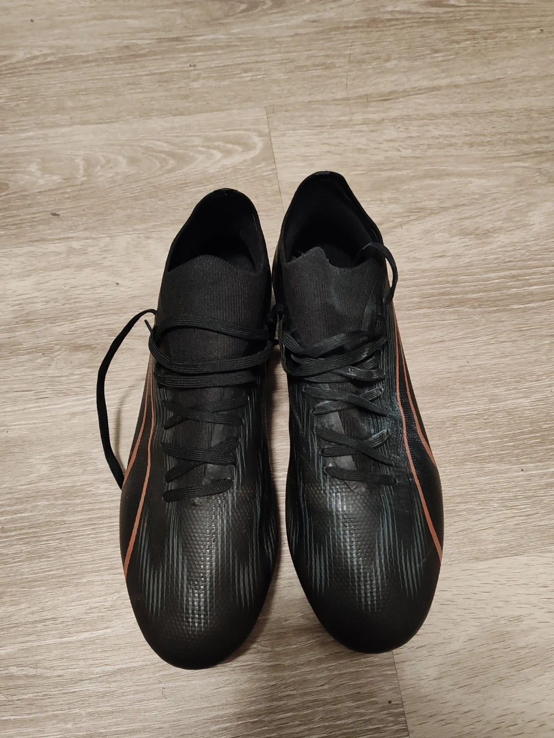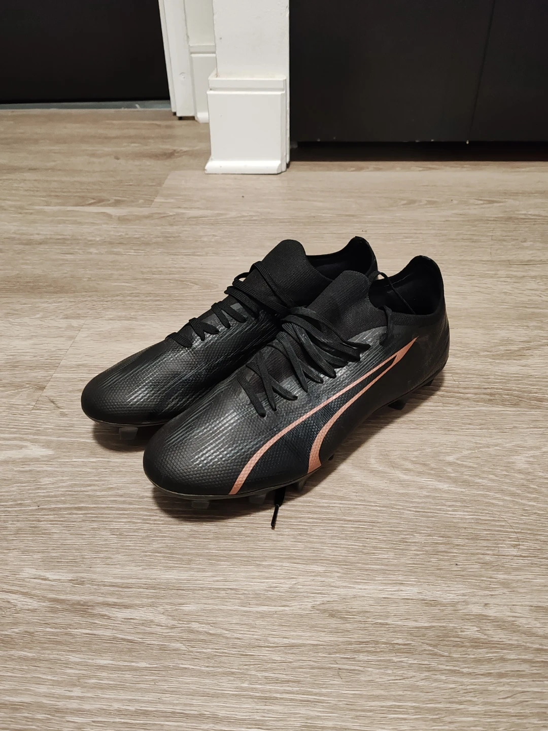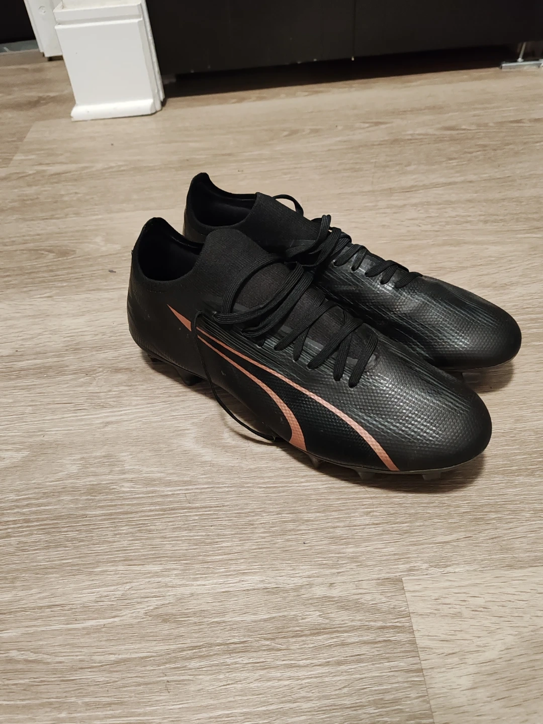 Black Puma soccer cleats with rose gold accents. These cleats offer a snug fit and are designed for firm ground. They're lightweight for speed on the pitch! Size 10