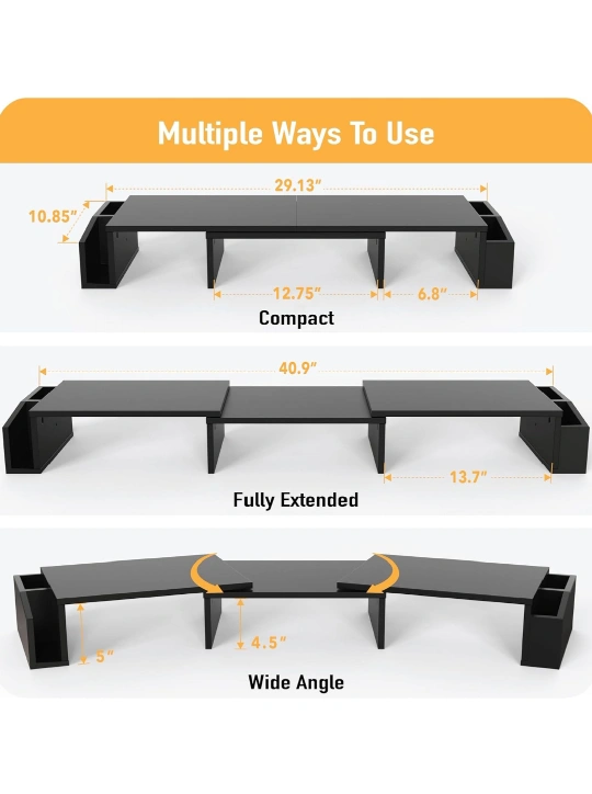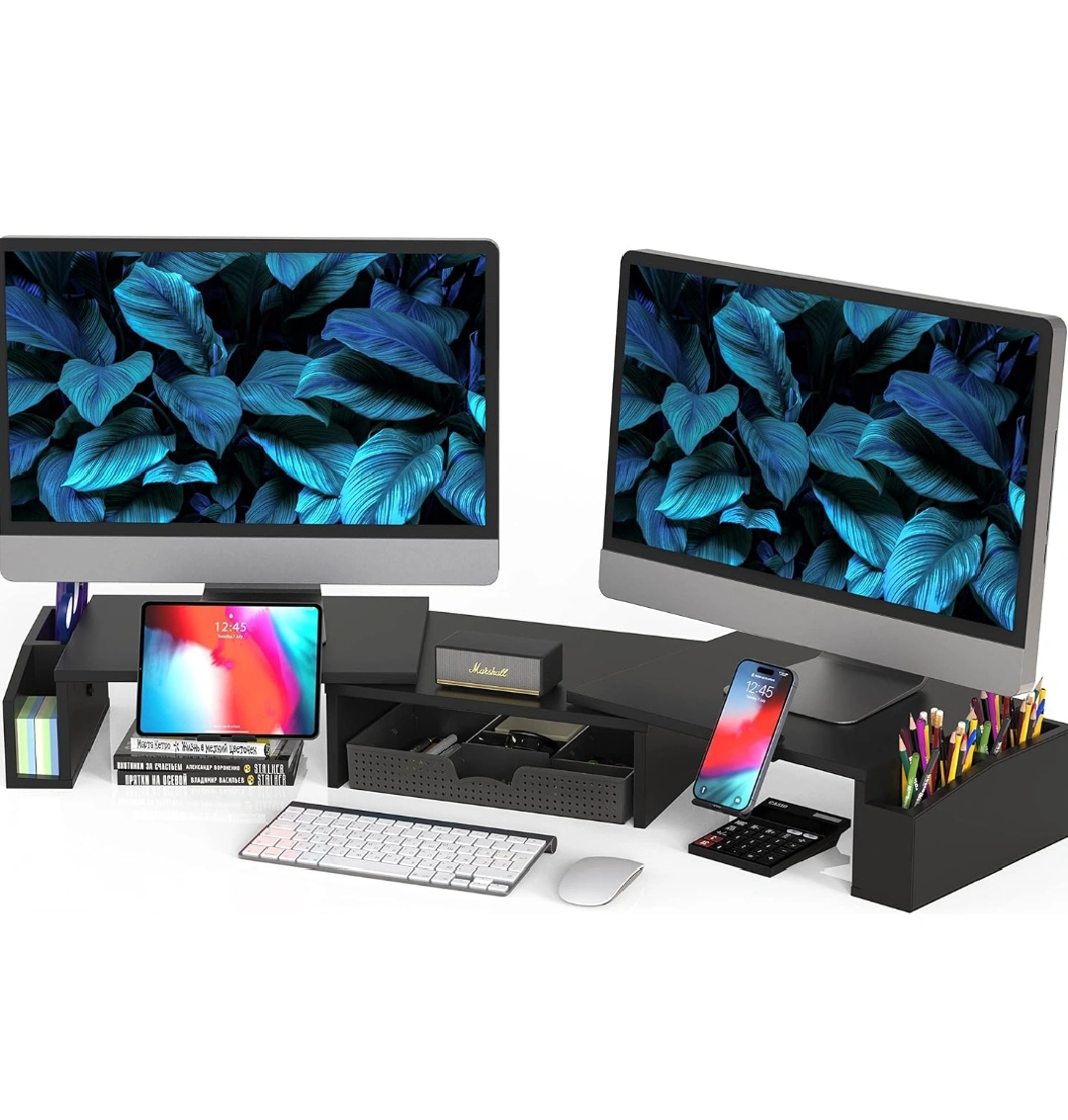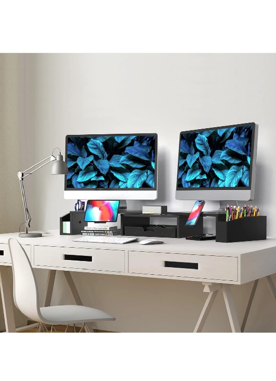 This stand features a drawer, a tablet holder, phone holder, and pen holder. It can be used with two monitors or one monitor, and it can be placed in a variety of positions.
