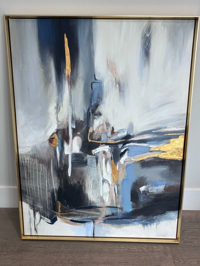 Add a touch of modern elegance to your space with this captivating abstract painting. The artwork features a sophisticated blend of neutral tones accented with shimmering gold leaf, creating a visually stunning piece. The painting comes framed, ready to hang and enhance any room.
