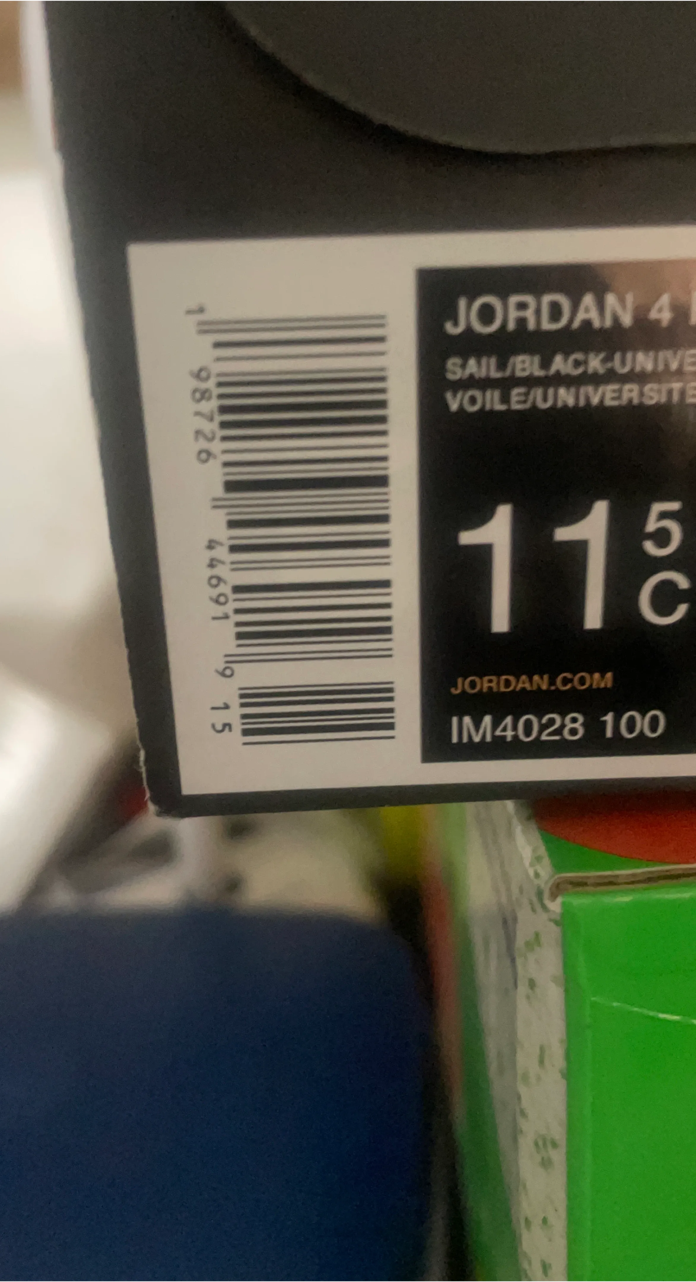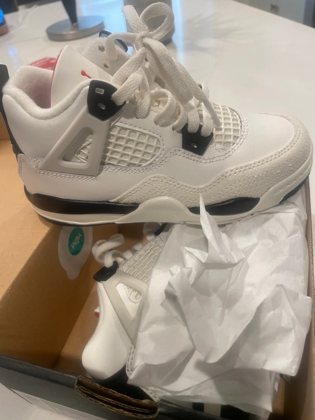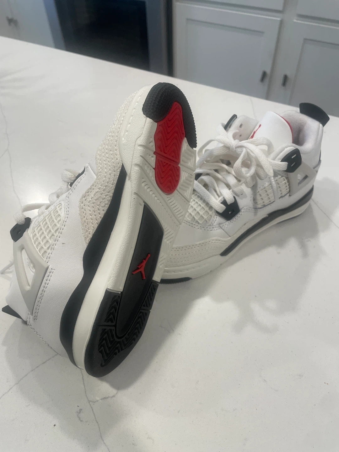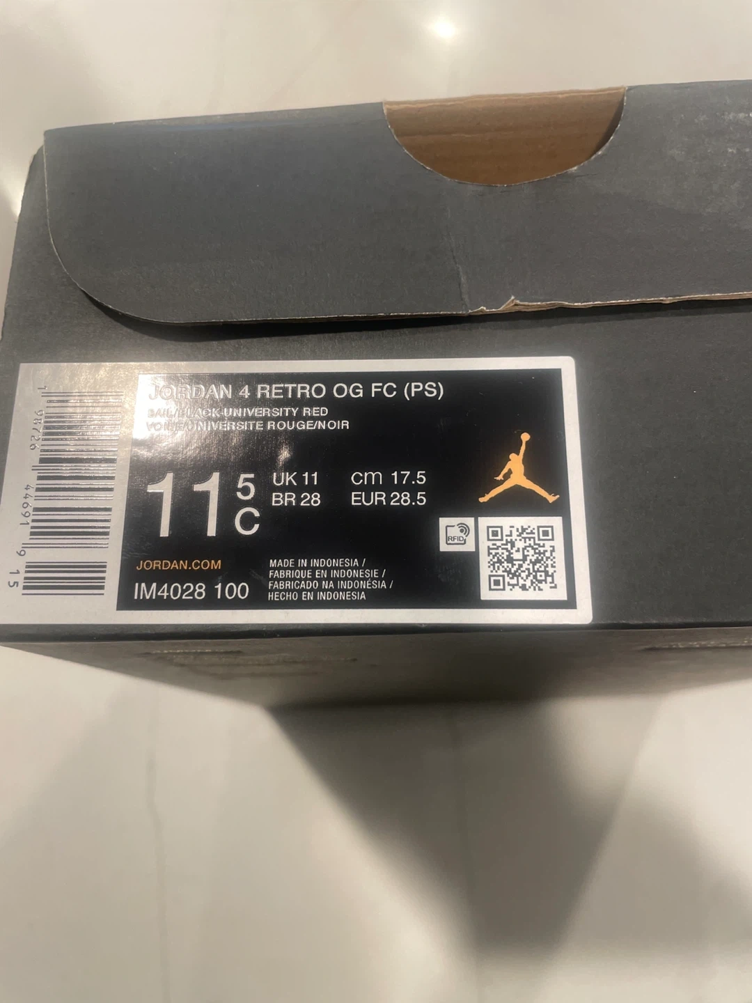 Toddler Jordan 4 Retro OG FC shoes in a sail, black, and university red colorway. These are a size 11.5C. Includes original box. Perfect for little sneakerheads!