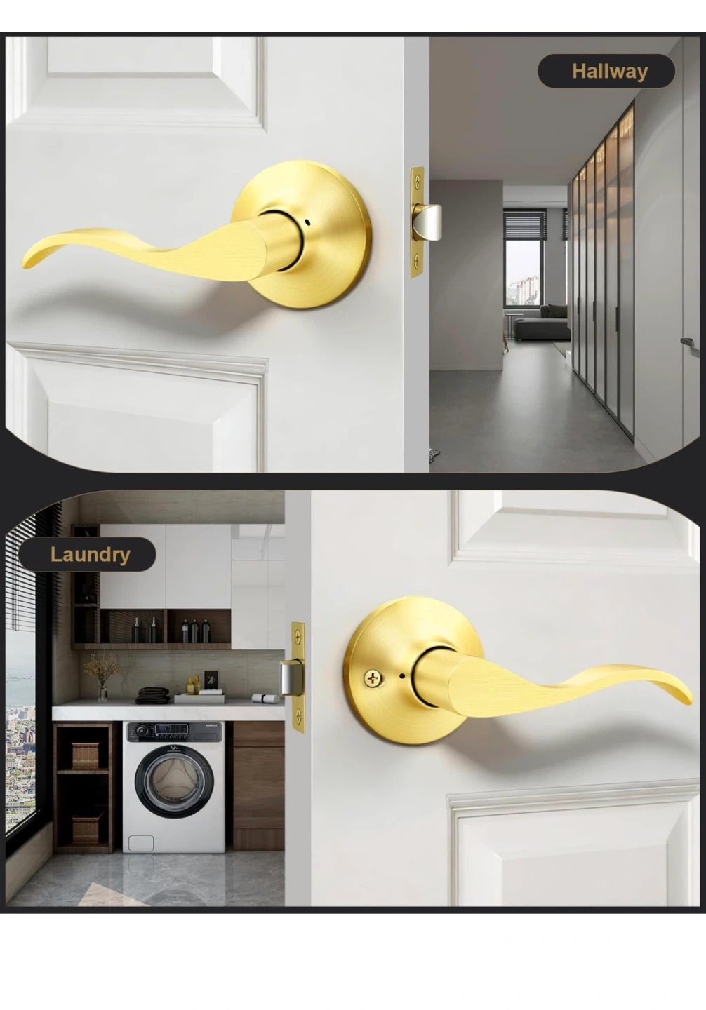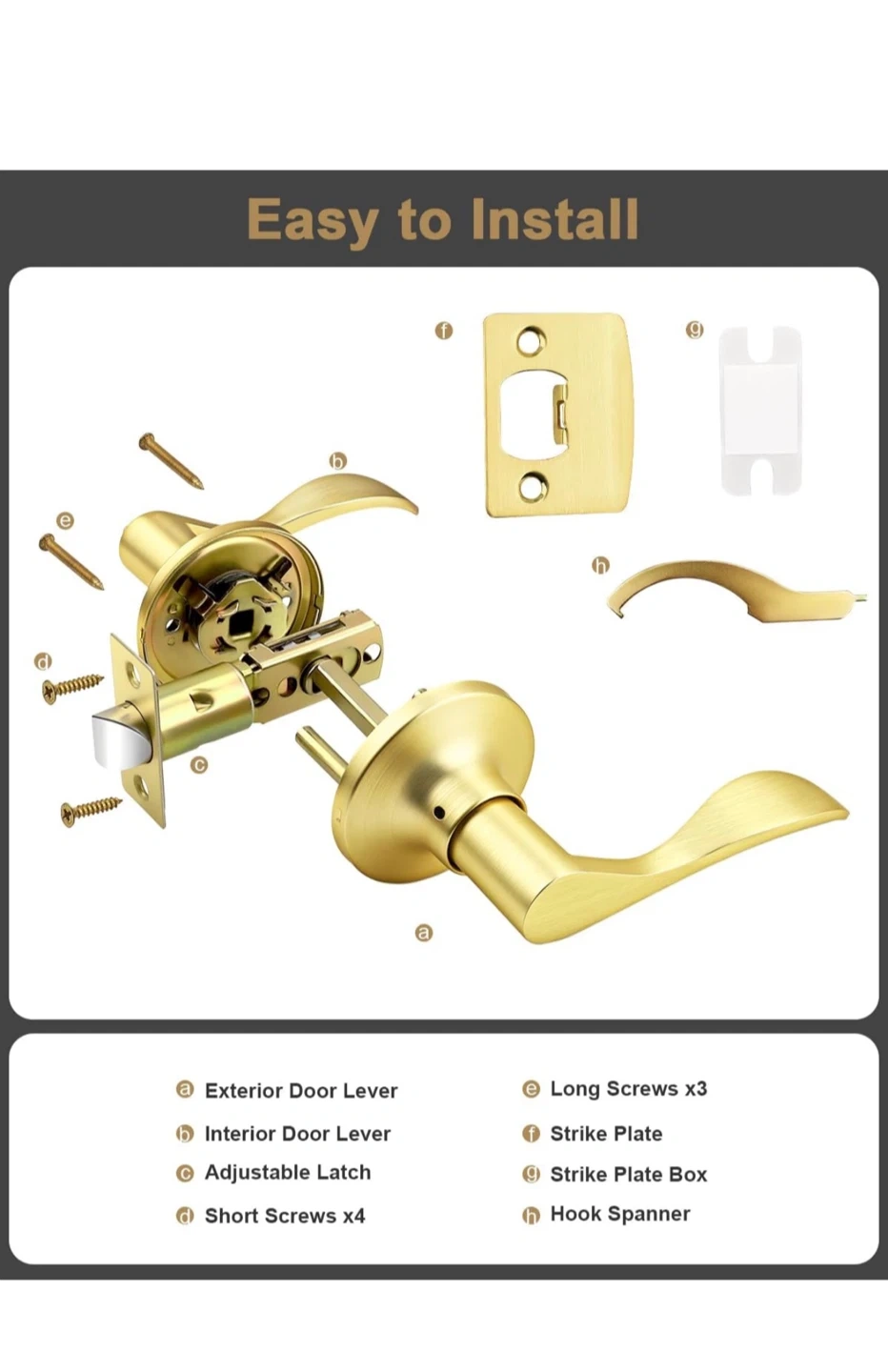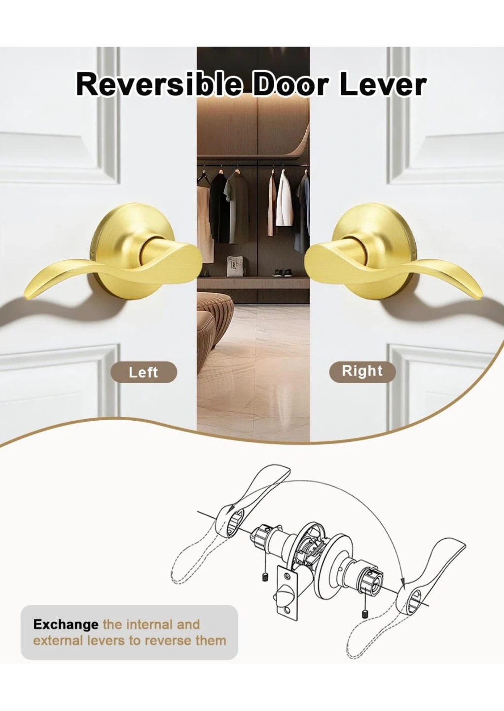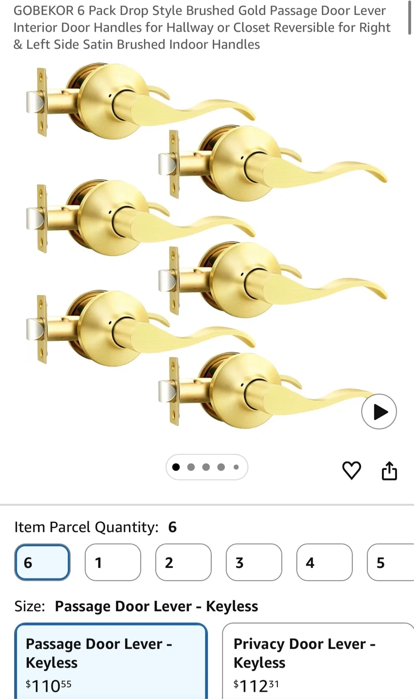 This is a 6 pack of GOBEKOR passage door levers. They feature a satin gold finish and a reversible design for left or right-side installation. These levers are keyless and built to ANSI Grade Standard.