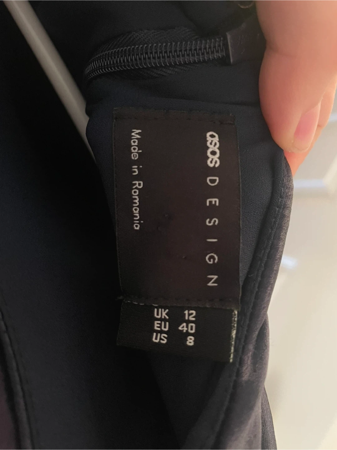 WORN ONCE ONLY. This navy blue satin dress from ASOS DESIGN features a stylish asymmetrical drape. It's a UK size 12, EU size 40, and US size 8. The material is satin and it's made in Romania. This dress is perfect for an evening event!