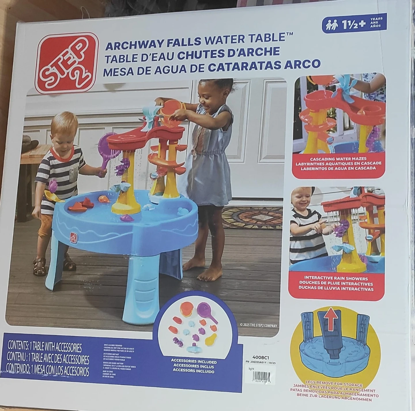 This Step 2 Archway Falls Water Table comes with accessories for endless water play. Features cascading water mazes and interactive rain showers. Legs remove for easy storage. Recommended for ages 1 1/2+.